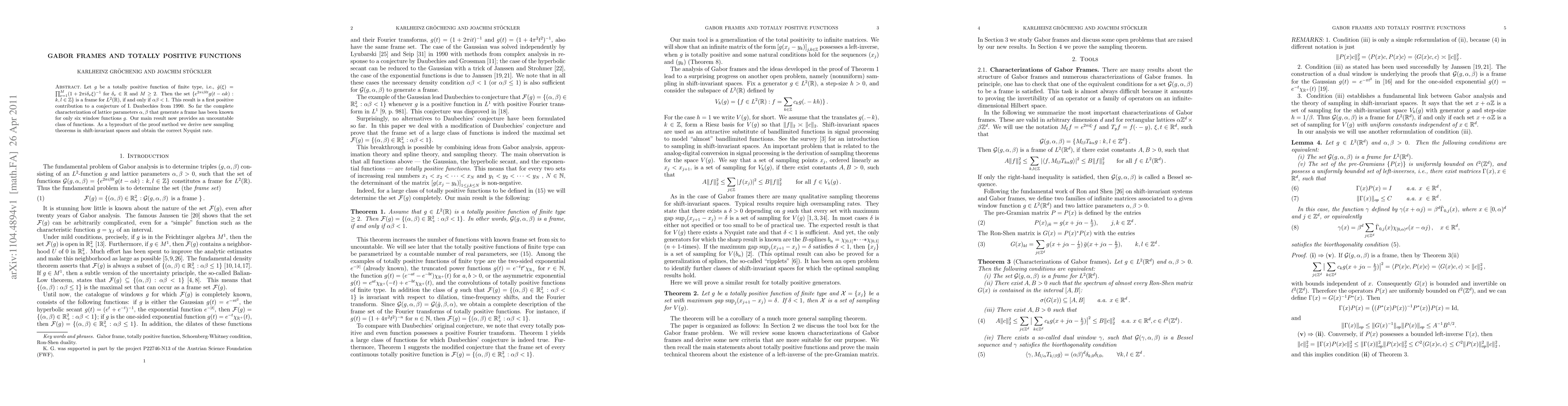 Let $g$ be a totally positive function of finite type. Then the Gabor set $\{e^{2\pi i \beta l t} g(t-\alpha k), k,l \in Z \}$ is a frame for $L^2(R)$, if and only if $\alpha \beta <1$. This result is a first positive contribution to a conjecture of I.\ Daubechies from 1990. So far the complete characterization of lattice parameters $\alpha, \beta $ that generate a frame has been known for only six window functions $g$. Our main result now provides an uncountable class of functions. As a byproduct of the proof method we derive new sampling theorems in shift-invariant spaces and obtain the correct Nyquist rate.