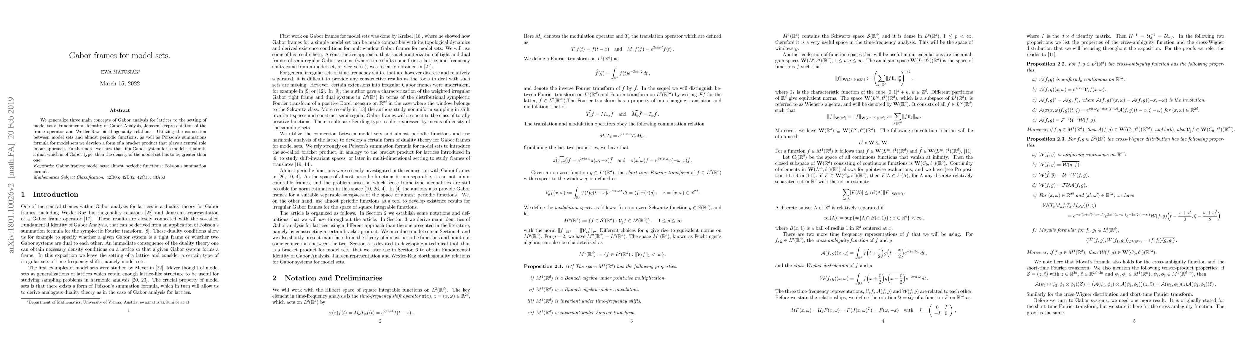 We generalize three main concepts of Gabor analysis for lattices to the setting of model sets: Fundamental Identity of Gabor Analysis, Janssen's representation of the frame operator and Wexler-Raz biorthogonality relations. Utilizing the connection between model sets and almost periodic functions, as well as Poisson's summations formula for model sets we develop a form of a bracket product that plays a central role in our approach. Furthermore, we show that, if a Gabor system for a model set admits a dual which is of Gabor type, then the density of the model set has to be greater than one.