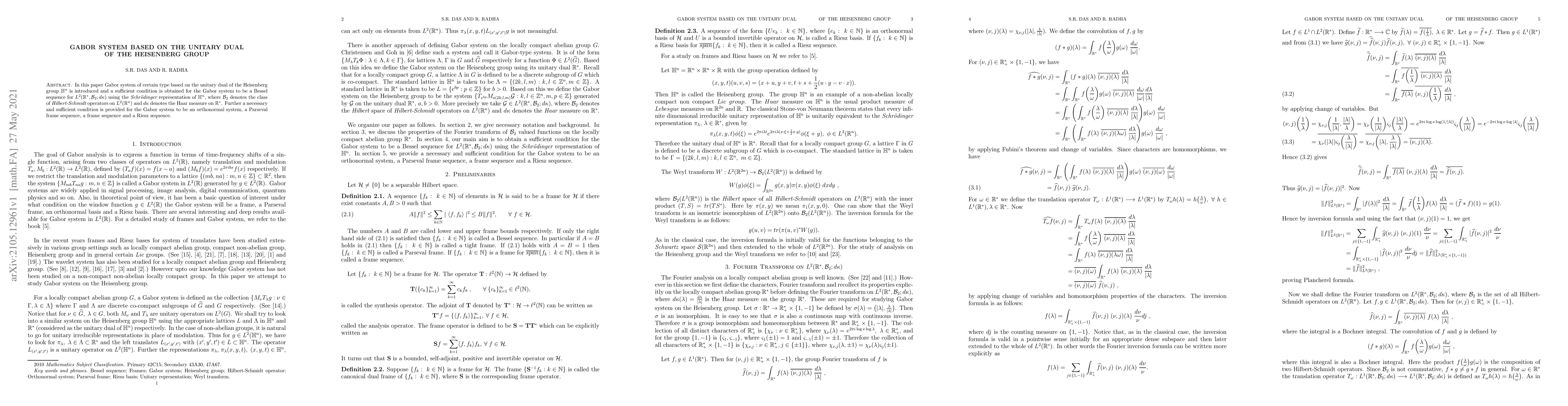 In this paper Gabor system of certain type based on the unitary dual of the Heisenberg group $\mathbb{H}^n$ is introduced and a sufficient condition is obtained for the Gabor system to be a Bessel sequence for $L^2(\mathbb{R}^*,\mathcal{B}_2;d\kappa)$ using the $Schr\"{o}dinger$ representation of $\mathbb{H}^n$, where $\mathcal{B}_2$ denotes the class of Hilbert-Schmidt operators on $L^2(\mathbb{R}^n)$ and $d\kappa$ denotes the Haar measure on $\mathbb{R}^*$. Further a necessary and sufficient condition is provided for the Gabor system to be an orthonormal system, a Parseval frame sequence, a frame sequence and a Riesz sequence.