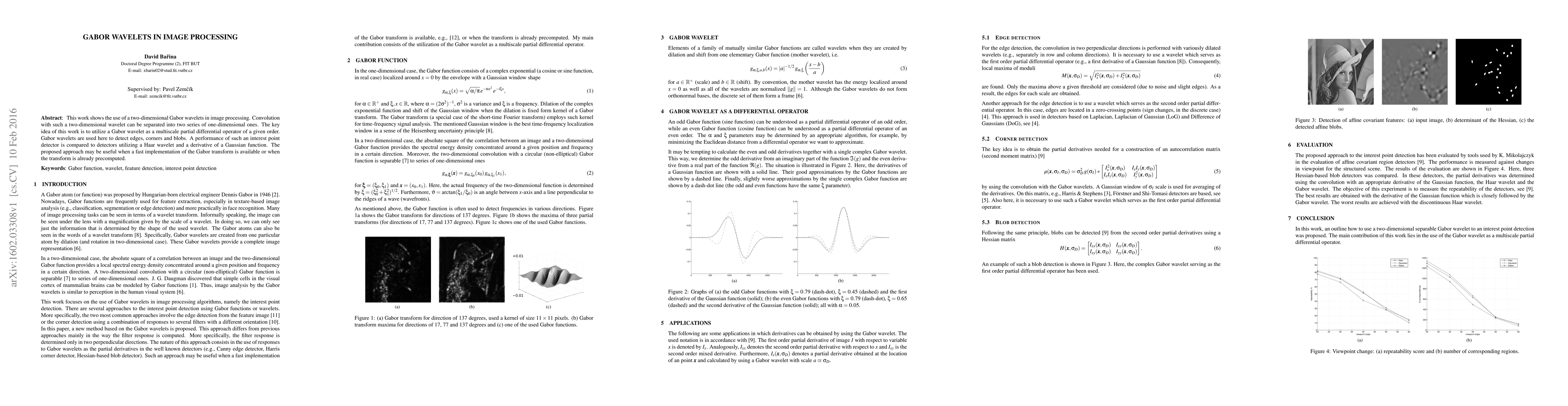 This paper explores the application of two-dimensional Gabor wavelets in image processing, demonstrating their effectiveness as multiscale partial differential operators for detecting edges, corners, and blobs. The performance of the Gabor wavelet-based detector is compared to those using Haar wavelets and Gaussian derivatives, highlighting its utility in fast implementations.