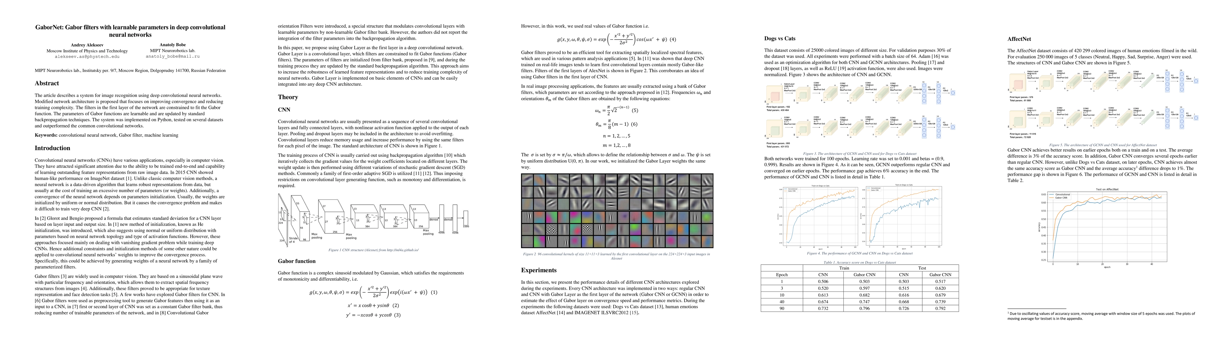 The article describes a system for image recognition using deep convolutional neural networks. Modified network architecture is proposed that focuses on improving convergence and reducing training complexity. The filters in the first layer of the network are constrained to fit the Gabor function. The parameters of Gabor functions are learnable and are updated by standard backpropagation techniques. The system was implemented on Python, tested on several datasets and outperformed the common convolutional networks.