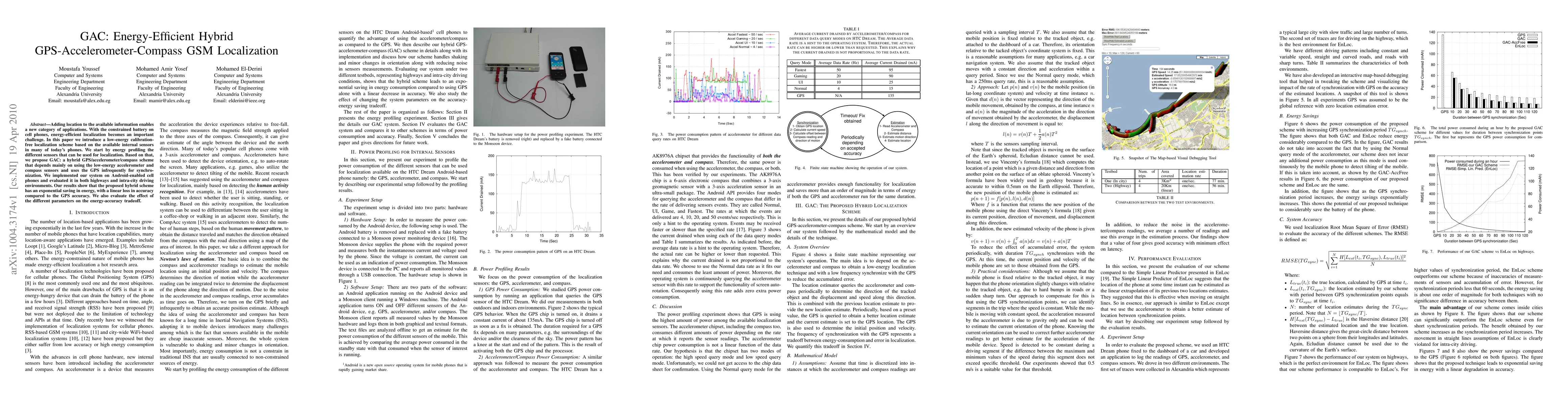 This paper introduces GAC, an energy-efficient localization scheme for smartphones that primarily uses low-energy accelerometer and compass sensors, with GPS used sparingly for synchronization. The hybrid approach significantly reduces energy consumption with a manageable linear loss in accuracy compared to GPS alone.