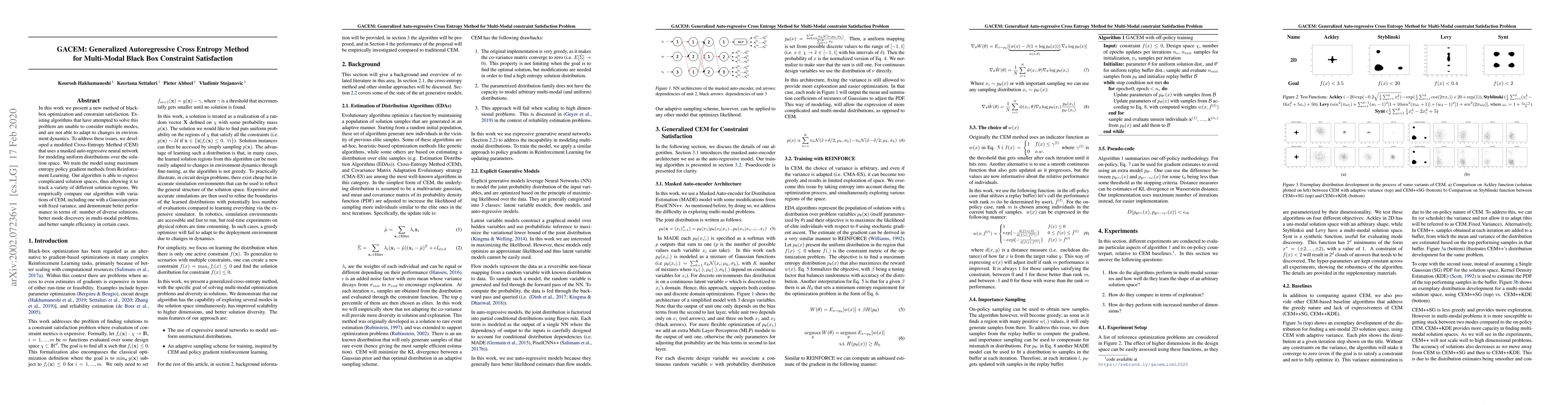 This research introduces GACEM, a novel algorithm for black-box optimization and constraint satisfaction. GACEM, a modified Cross-Entropy Method using a masked auto-regressive neural network, outperforms traditional methods by effectively handling multiple modes and adapting to dynamic environments, providing more diverse solutions, better mode discovery, and improved sample efficiency.