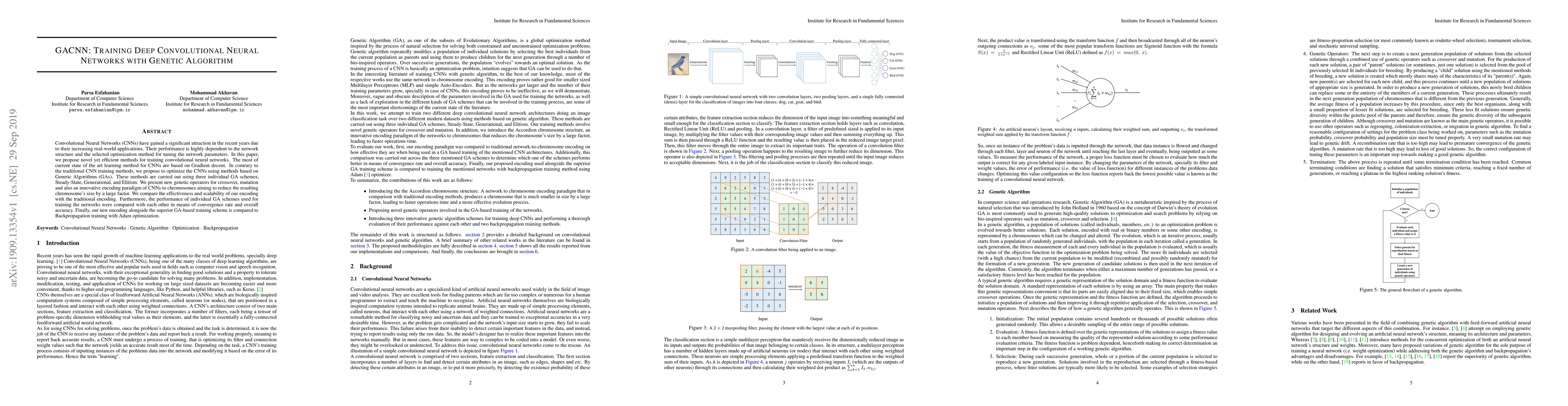 Convolutional Neural Networks (CNNs) have gained a significant attraction in the recent years due to their increasing real-world applications. Their performance is highly dependent to the network structure and the selected optimization method for tuning the network parameters. In this paper, we propose novel yet efficient methods for training convolutional neural networks. The most of current state of the art learning method for CNNs are based on Gradient decent. In contrary to the traditional CNN training methods, we propose to optimize the CNNs using methods based on Genetic Algorithms (GAs). These methods are carried out using three individual GA schemes, Steady-State, Generational, and Elitism. We present new genetic operators for crossover, mutation and also an innovative encoding paradigm of CNNs to chromosomes aiming to reduce the resulting chromosome's size by a large factor. We compare the effectiveness and scalability of our encoding with the traditional encoding. Furthermore, the performance of individual GA schemes used for training the networks were compared with each other in means of convergence rate and overall accuracy. Finally, our new encoding alongside the superior GA-based training scheme is compared to Backpropagation training with Adam optimization.