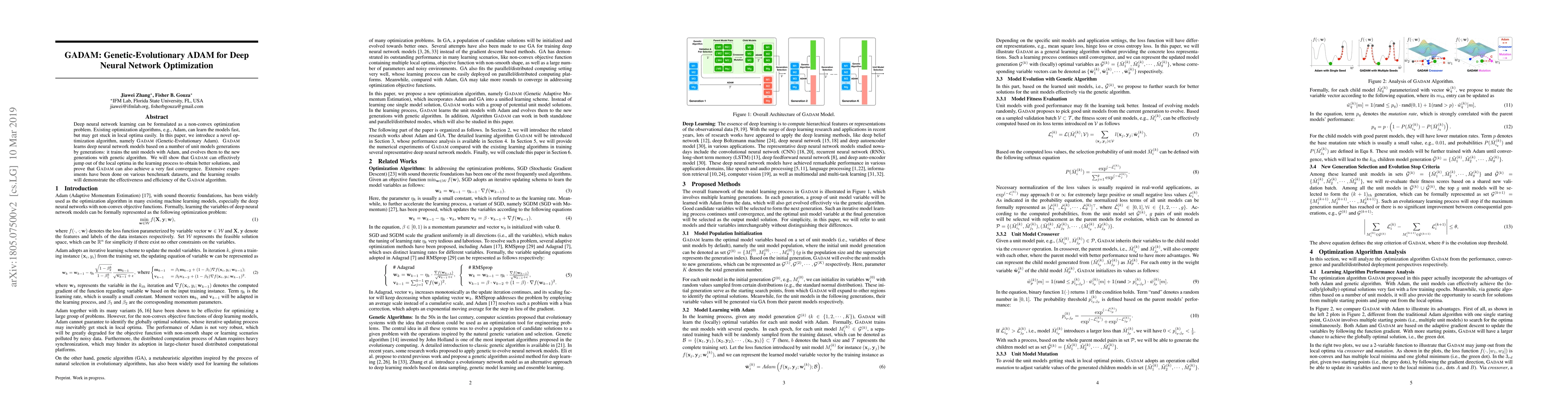 The paper introduces GADAM, a new optimization method that combines genetic algorithms with Adam to improve deep neural network training, helping models escape local optima and converge faster. Experiments show GADAM outperforms existing methods in achieving better results efficiently.