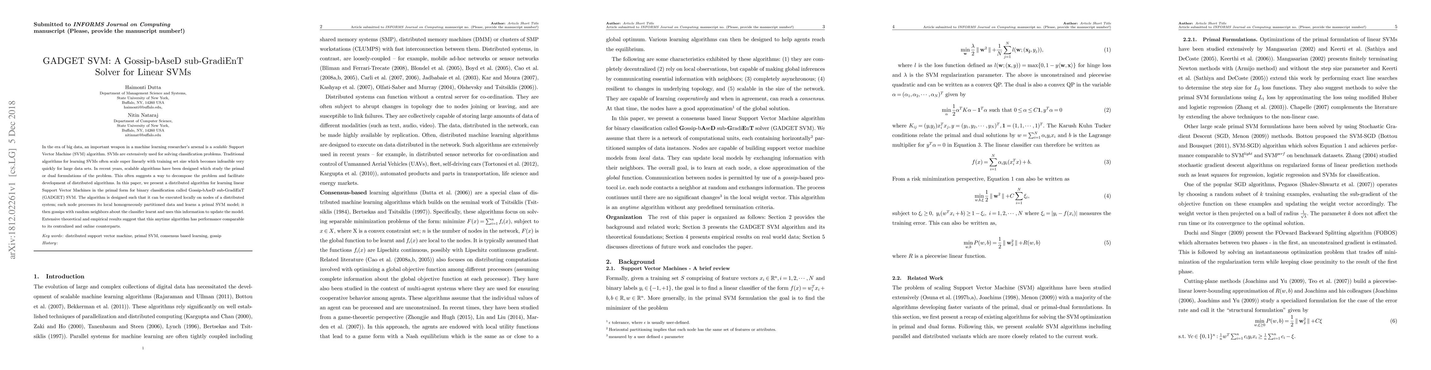 This paper introduces GADGET SVM, a scalable distributed algorithm for learning linear Support Vector Machines using a gossip-based sub-gradient approach. It achieves performance comparable to centralized and online methods while efficiently handling large datasets by leveraging distributed computation.