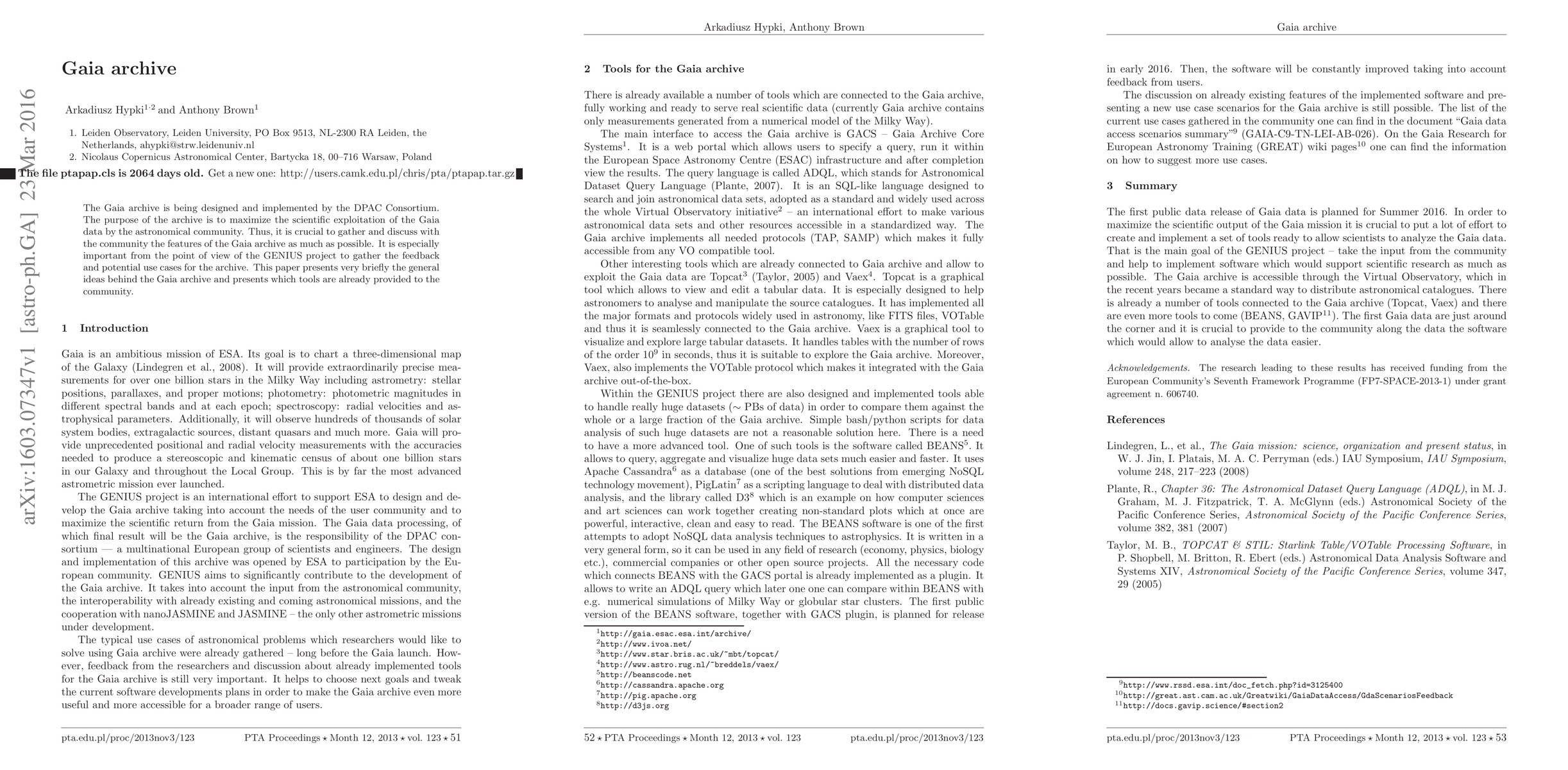 The Gaia archive, developed by the DPAC Consortium, aims to maximize scientific use of Gaia data. It provides essential tools and gathers community feedback, particularly for the GENIUS project, to enhance its utility.