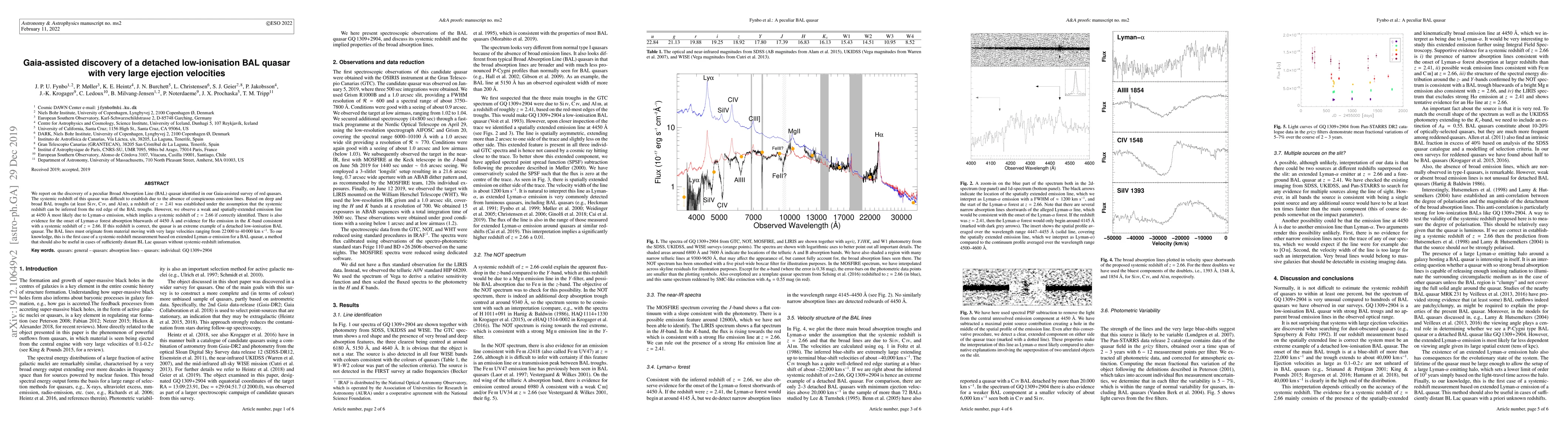 This paper reports the discovery of a unique Broad Absorption Line (BAL) quasar identified via a Gaia-assisted survey, characterized by detached low-ionisation BAL troughs and extremely high ejection velocities (22,000 to 40,000 km/s). The systemic redshift is contentious, with evidence suggesting a redshift of z=2.66 based on Lyman-alpha emission, marking a novel method for redshift determination in distant BAL quasars.