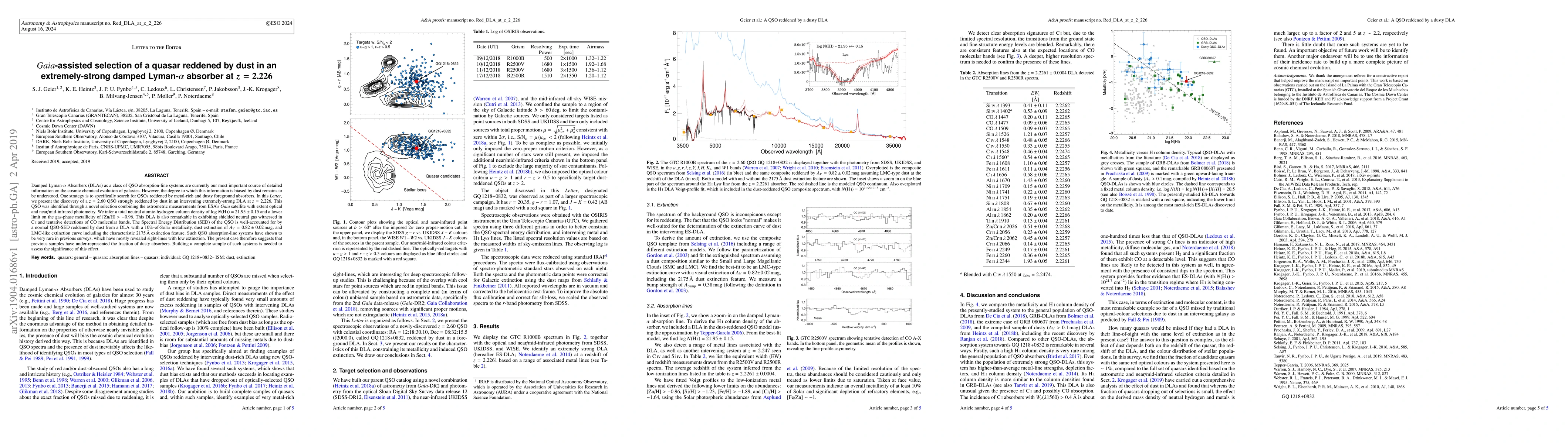 This paper reports the discovery of a z=2.60 quasar (QSO) heavily reddened by dust in an extremely strong Damped Lyman-α Absorber (DLA) at z=2.226, identified using Gaia astrometric data and multi-wavelength photometry. The study reveals significant insights into the cosmic chemical evolution and the under-representation of dusty absorbers in previous surveys.