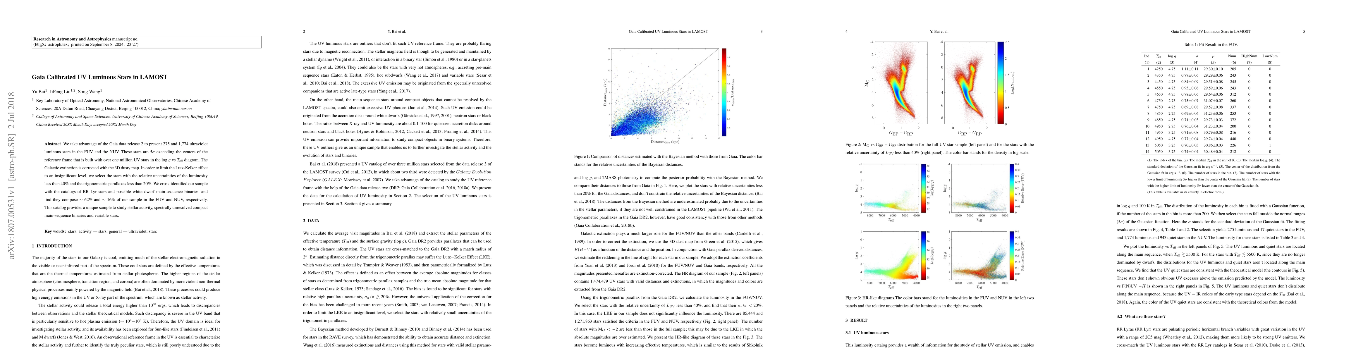 We take advantage of the Gaia data release 2 to present 275 and 1,774 ultraviolet luminous stars in the FUV and the NUV. These stars are 5$\sigma$ exceeding the centers of the reference frame that is built with over one million UV stars in the log $g$ vs $T_\textrm{eff}$ diagram. The Galactic extinction is corrected with the 3D dusty map. In order to limit the Lutz-Kelker effect to an insignificant level, we select the stars with the relative uncertainties of the luminosity less than 40% and the trigonometric parallaxes less than 20%. We cross-identified our sample with the catalogs of RR Lyr stars and possible white dwarf main-sequence binaries, and find they compose $\sim$ 62% and $\sim$ 16% of our sample in the FUV and NUV, respectively. This catalog provides a unique sample to study stellar activity, spectrally unresolved compact main-sequence binaries and variable stars.
