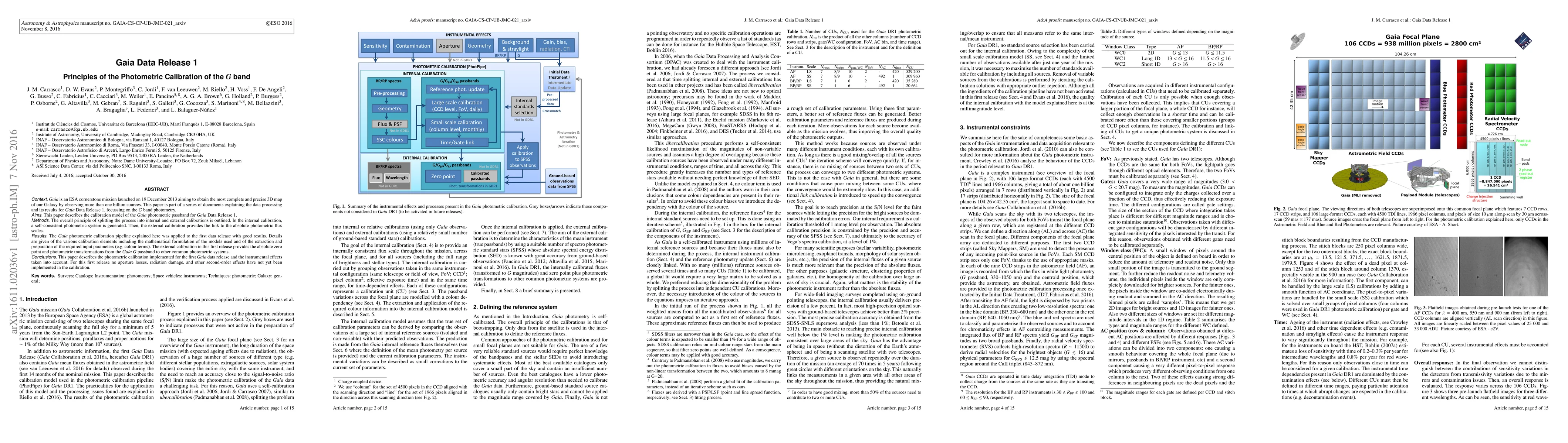 Gaia Data Release 1's G band photometry calibration model combines internal and external calibrations to create a self-consistent photometric system and link it to absolute flux scales. The calibration pipeline was successfully applied to the first data release, detailing the mathematical models and input parameters used.