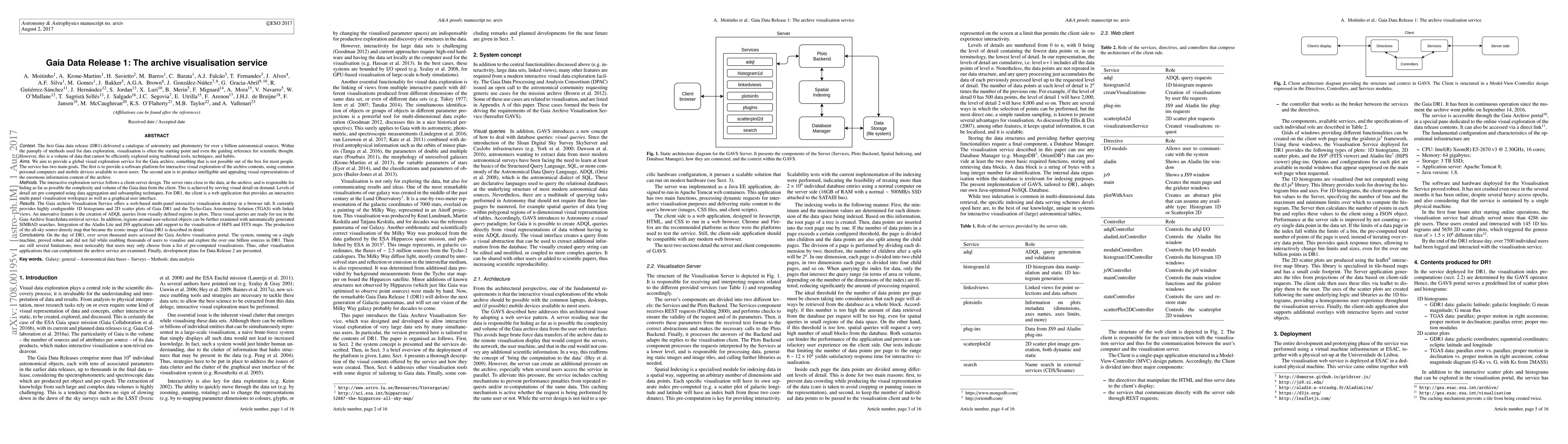 The Gaia Data Release 1 Visualisation Service provides an interactive web-based platform for exploring the vast Gaia archive, offering configurable 1D and 2D plots, and enabling the creation of ADQL queries from visual selections, all while managing the data's complexity and volume efficiently.