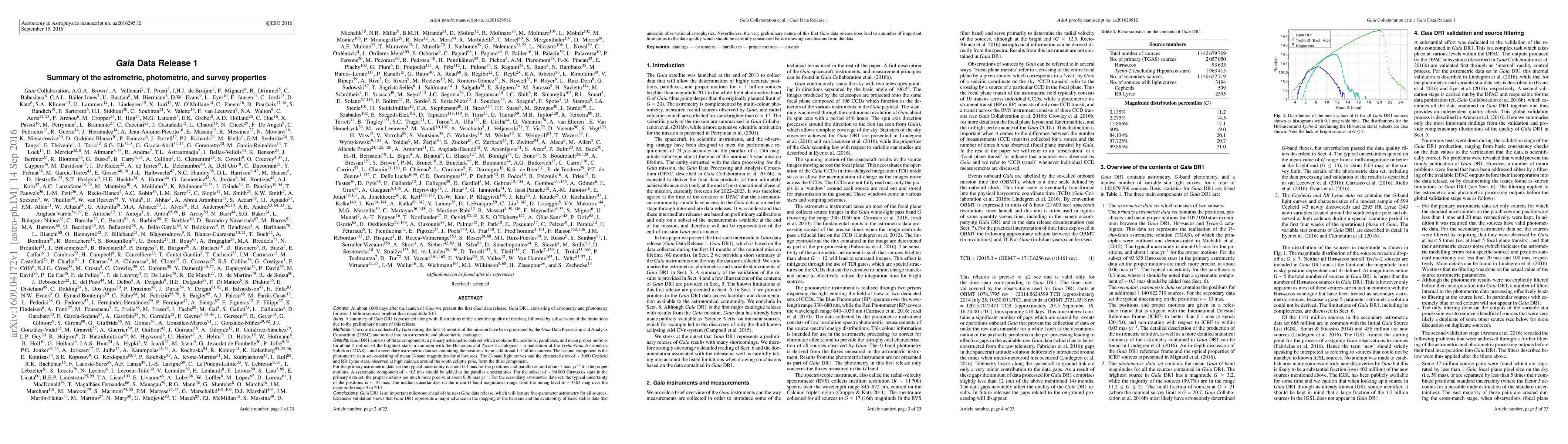 Gaia Data Release 1 (DR1) presents astrometry and photometry for over 1 billion sources, including precise positions, parallaxes, and proper motions for 2 million stars, and less precise data for an additional 1.1 billion. The release marks a significant leap in stellar mapping but highlights limitations due to its preliminary nature.