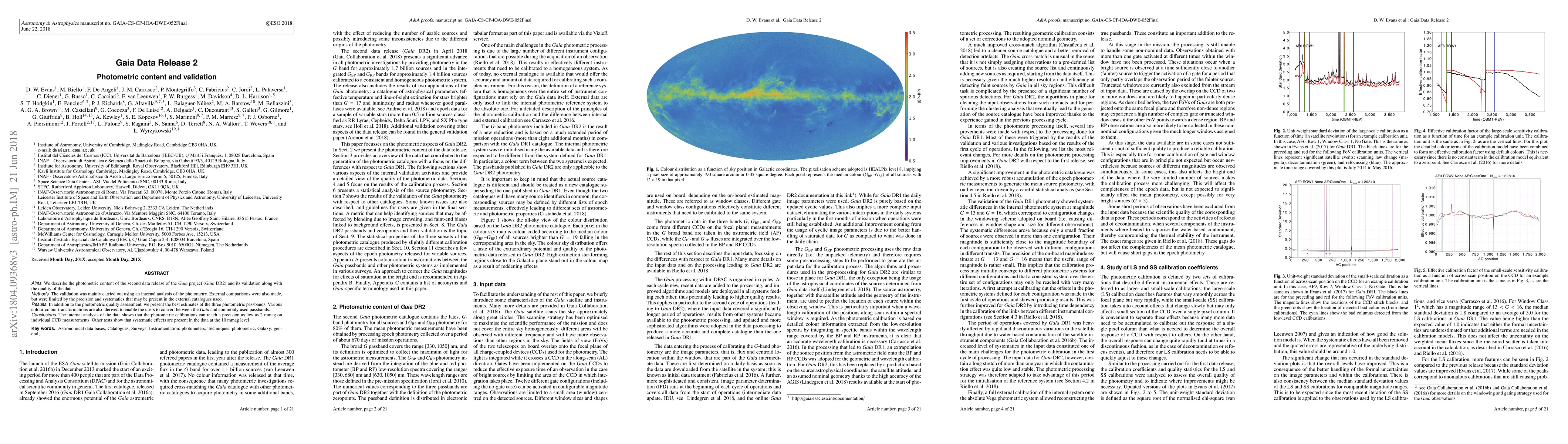 Gaia Data Release 2 (DR2) provides detailed photometric content validated through internal and limited external comparisons. The data shows photometric calibrations with precision down to 2 mmag, though systematic effects remain at 10 mmag.