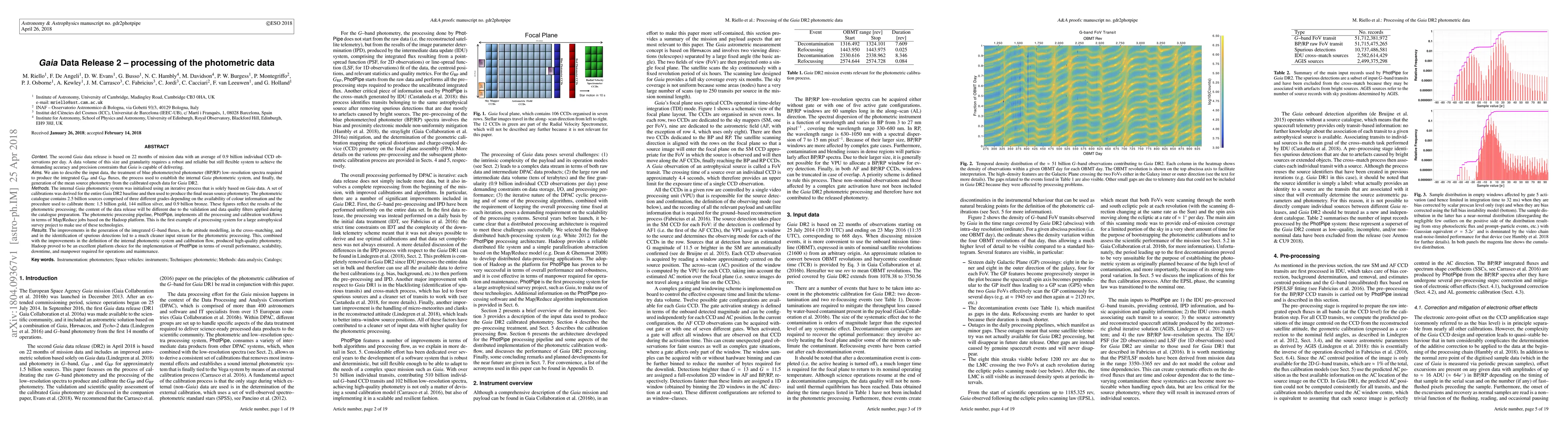 Gaia Data Release 2 (DR2) utilized 22 months of data, comprising 0.9 billion daily CCD observations, processed through a robust PhotPipe pipeline on the Hadoop platform. The resulting photometric catalogue includes 2.5 billion sources, categorized into gold, silver, and bronze grades based on calibration and color information.
