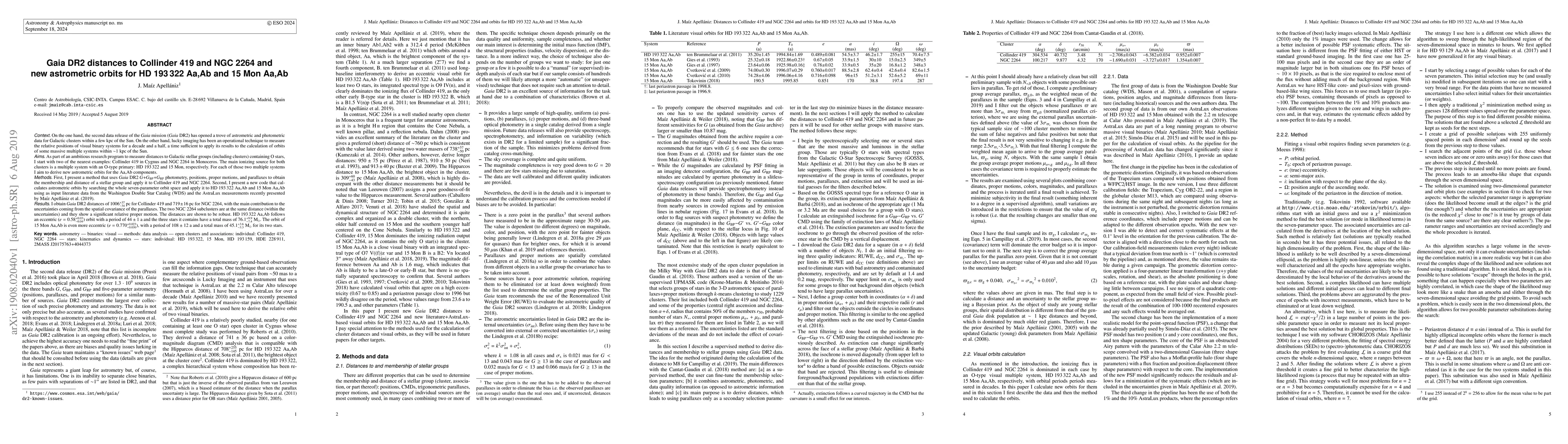 [ABRIDGED] CONTEXT: Gaia DR2 has opened a trove of astrometric and photometric data for Galactic clusters close to the Sun. Lucky imaging has been an operational technique to measure the positions of visual binary systems for a decade and a half, enough to apply its results to the calculation of orbits of some massive multiple systems within ~1 kpc of the Sun. AIMS: We are measuring distances to Galactic stellar groups containing O stars and I start with two of them: Collinder 419 in Cygnus and NGC 2264 in Monoceros. I also aim to derive new astrometric orbits for the Aa,Ab components for the main ionizing sources for both clusters: HD 193 322 and 15 Mon, respectively. METHODS: First, I present a method that uses Gaia DR2 photometry, positions, proper motions, and parallaxes to obtain the membership and distance of a stellar group and apply it to Collinder 419 and NGC 2264. Second, I present a new code that calculates astrometric orbits by searching the whole 7-parameter orbit space and apply it to HD 193 322 Aa,Ab and 15 Mon Aa,Ab using as input literature data from the Washington Double Star Catalog (WDS) and the AstraLux measurements recently presented by Ma\'iz Apell\'aniz et al. (2019). RESULTS: I obtain Gaia DR2 distances of 1006+37-34 pc for Collinder 419 and 719+-16 pc for NGC 2264, with the main contribution to the uncertainties coming from the spatial covariance of the parallaxes. The two NGC 2264 subclusters are at the same distance (within the uncertainties) and they show a significant relative proper motion. The distances are shown to be robust. HD 193 322 Aa,Ab follows an eccentric (e = 0.58+0.03-0.04) orbit with a period of 44+-1 a and the three stars it contains have a total mass of 76.1+9.9-7.4 M_Sol. The orbit of 15 Mon Aa,Ab is even more eccentric (e = 0.770+0.023-0.030), with a period of 108+-12 a and a total mass of 45.1+3.6-3.3 M_Sol for its two stars.