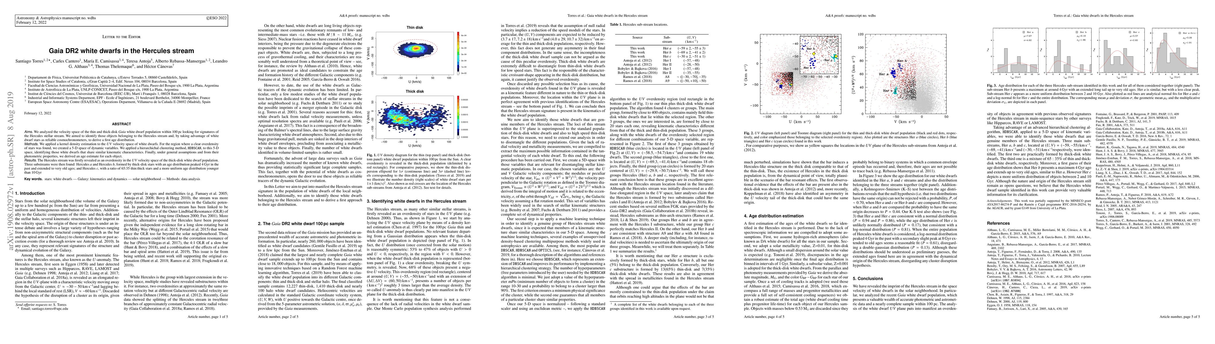 This paper identifies white dwarfs in the Hercules stream using Gaia DR2 data, revealing three substreams with distinct kinematic characteristics and age distributions, providing a first age estimate for the stream. The analysis employs hierarchical clustering and derives ages based on photometric properties.