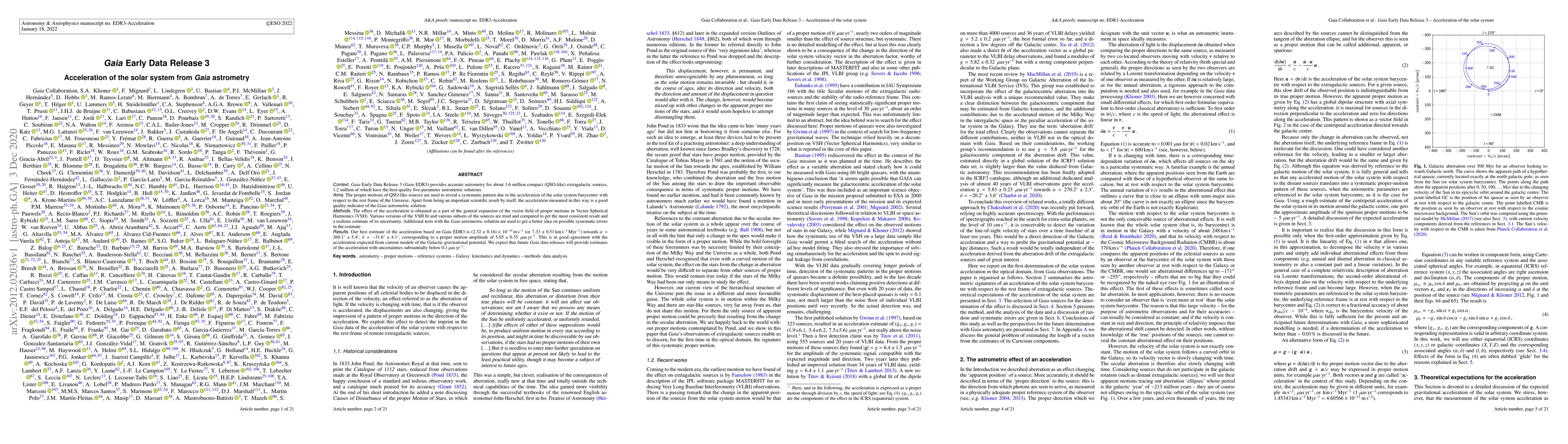 Gaia Early Data Release 3 (EDR3) measures the solar system's acceleration using proper motions of QSO-like sources, yielding an estimate of $(2.32 \pm 0.16) \times 10^{-10}$ m s$^{-2}$. This result validates the Gaia astrometric solution and aligns with Galactic gravitational potential models.