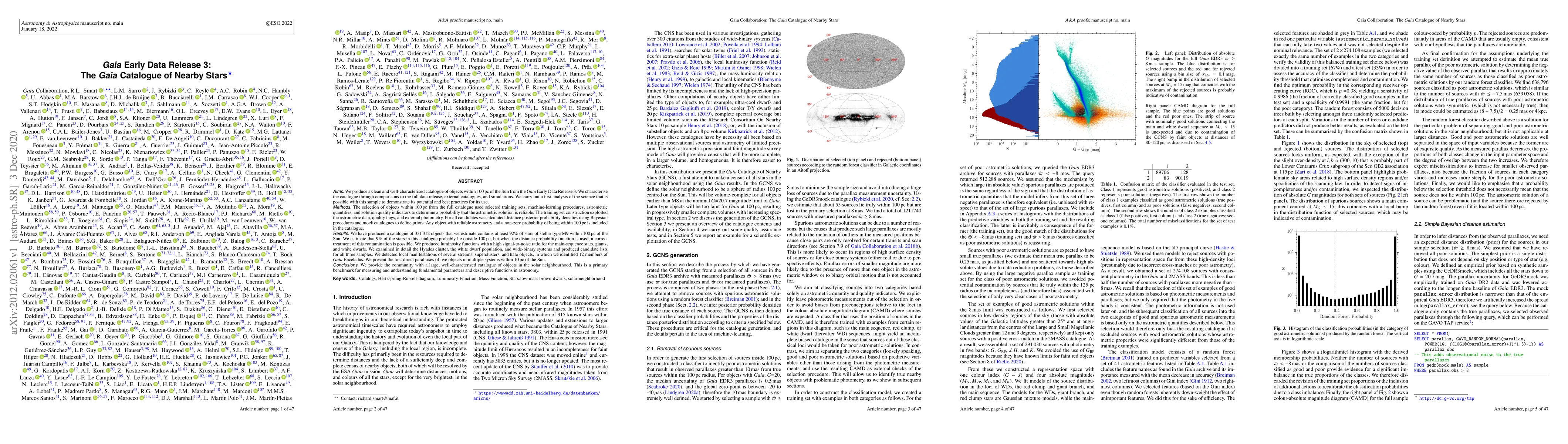 The Gaia Early Data Release 3 provides a refined catalogue of nearby stars within 100 pc of the Sun, characterized by reliable astrometric solutions and probabilistic distance assessments. The catalogue includes at least 92% of M9 stars within this range, with detailed analyses of clusters, white dwarfs, and binary systems, showcasing the data's scientific potential.