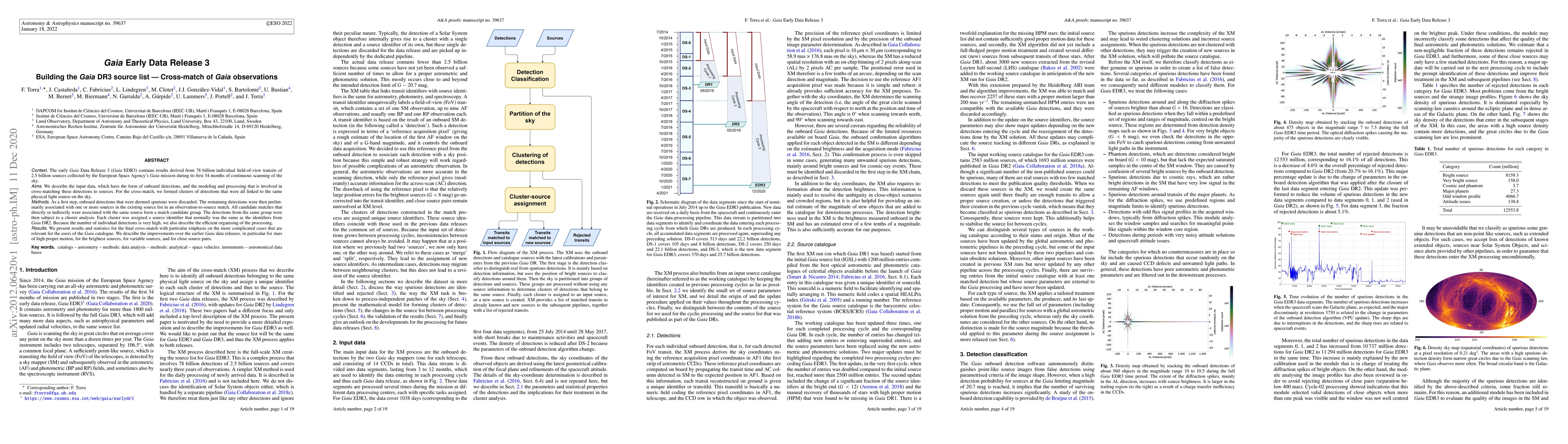 Gaia Early Data Release 3 (EDR3) compiles 78 billion detections from 2.5 billion sources observed by the Gaia mission over 34 months. The paper details the cross-matching process, clustering detections linked to the same physical source, and the improvements over previous releases, especially for high proper motion stars, bright sources, variable stars, and close source pairs.