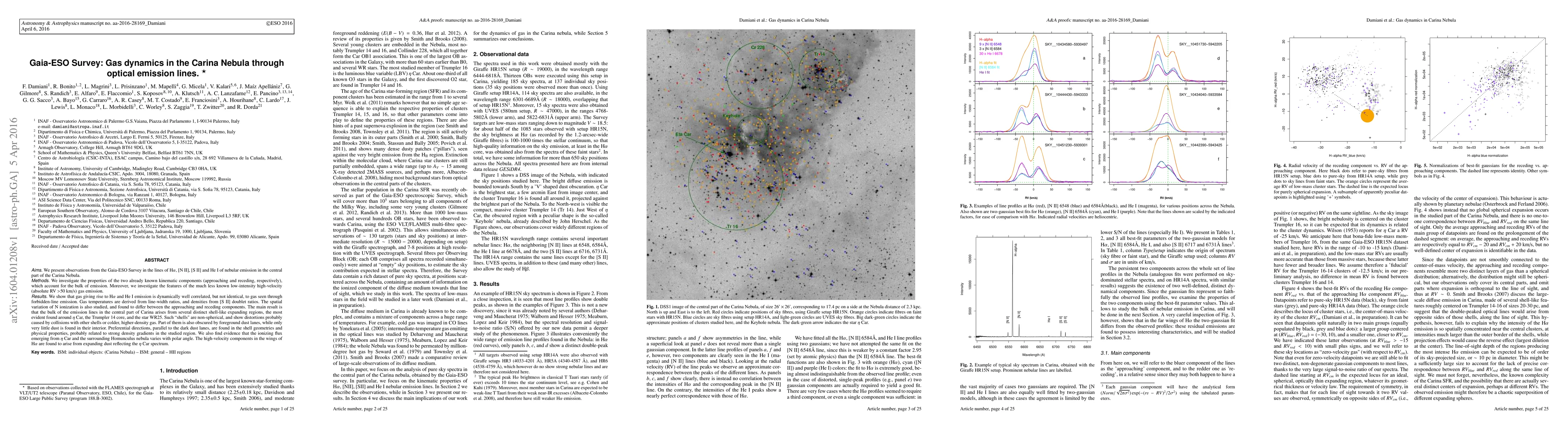 We present observations from the Gaia-ESO Survey in the lines of H$\alpha$, [N II], [S II] and He I of nebular emission in the central part of the Carina Nebula. We investigate the properties of the two already known kinematic components (approaching and receding, respectively), which account for the bulk of emission. Moreover, we investigate the features of the much less known low-intensity high-velocity (absolute RV $>$50 km/s) gas emission. We show that gas giving rise to H$\alpha$ and He I emission is dynamically well correlated, but not identical, to gas seen through forbidden-line emission. Gas temperatures are derived from line-width ratios, and densities from [S II] doublet ratios. The spatial variation of N ionization is also studied, and found to differ between the approaching and receding components. The main result is that the bulk of the emission lines in the central part of Carina arises from several distinct shell-like expanding regions, the most evident found around $\eta$ Car, the Trumpler 14 core, and the star WR25. Such "shells" are non-spherical, and show distortions probably caused by collisions with other shells or colder, higher-density gas. Part of them is also obscured by foreground dust lanes, while only very little dust is found in their interior. Preferential directions, parallel to the dark dust lanes, are found in the shell geometries and physical properties, probably related to strong density gradients in the studied region. We also find evidence that the ionizing flux emerging from $\eta$ Car and the surrounding Homunculus nebula varies with polar angle. The high-velocity components in the wings of H$\alpha$ are found to arise from expanding dust reflecting the $\eta$ Car spectrum.