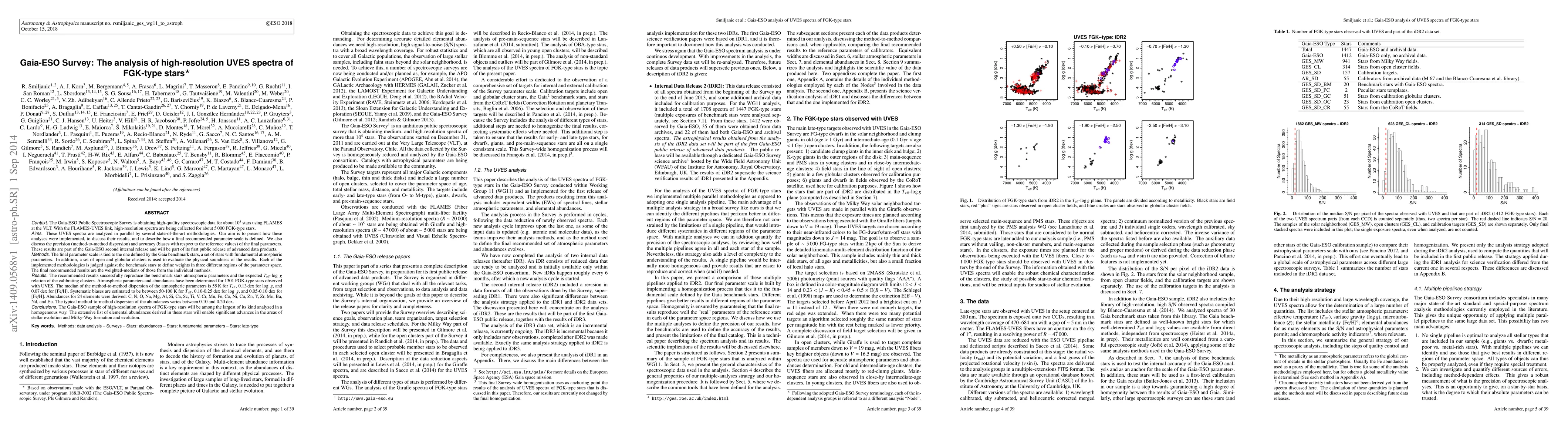 The Gaia-ESO Survey analyzes high-resolution UVES spectra from 5000 FGK-type stars using advanced methodologies to determine atmospheric parameters and elemental abundances. The final recommended parameter scale, tied to Gaia benchmark stars, shows precision dispersions of 55 K for Teff, 0.13 dex for log g, and 0.07 dex for [Fe/H], with systematic biases within 50-100 K, 0.10-0.25 dex, and 0.05-0.10 dex respectively.