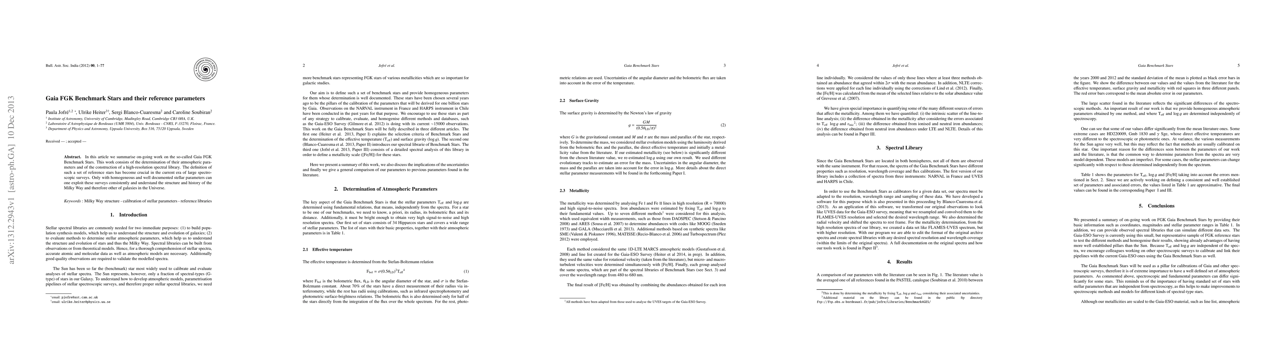 In this article we summarise on-going work on the so-called Gaia FGK Benchmark Stars. This work consists of the determination of their atmospheric parameters and of the construction of a high-resolution spectral library. The definition of such a set of reference stars has become crucial in the current era of large spectroscopic surveys. Only with homogeneous and well documented stellar parameters can one exploit these surveys consistently and understand the structure and history of the Milky Way and therefore other of galaxies in the Universe.