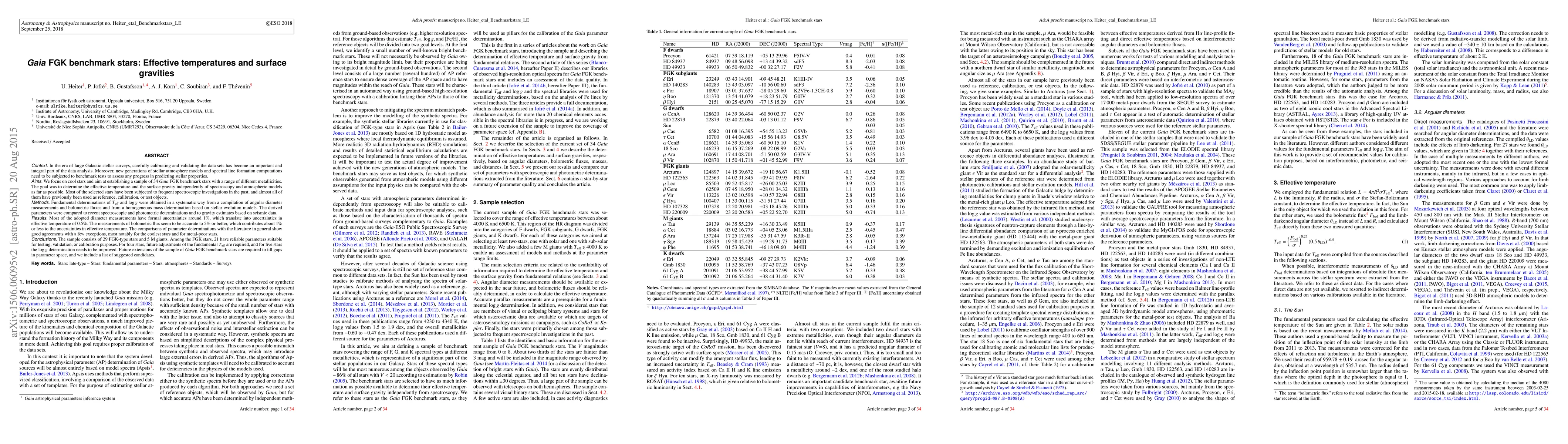 This paper establishes a sample of 34 Gaia FGK Benchmark Stars to calibrate stellar surveys and models, focusing on determining effective temperatures and surface gravities through angular diameters, bolometric fluxes, and stellar evolution models. The derived parameters show good agreement with literature values, with notable exceptions for the coolest and metal-poor stars.