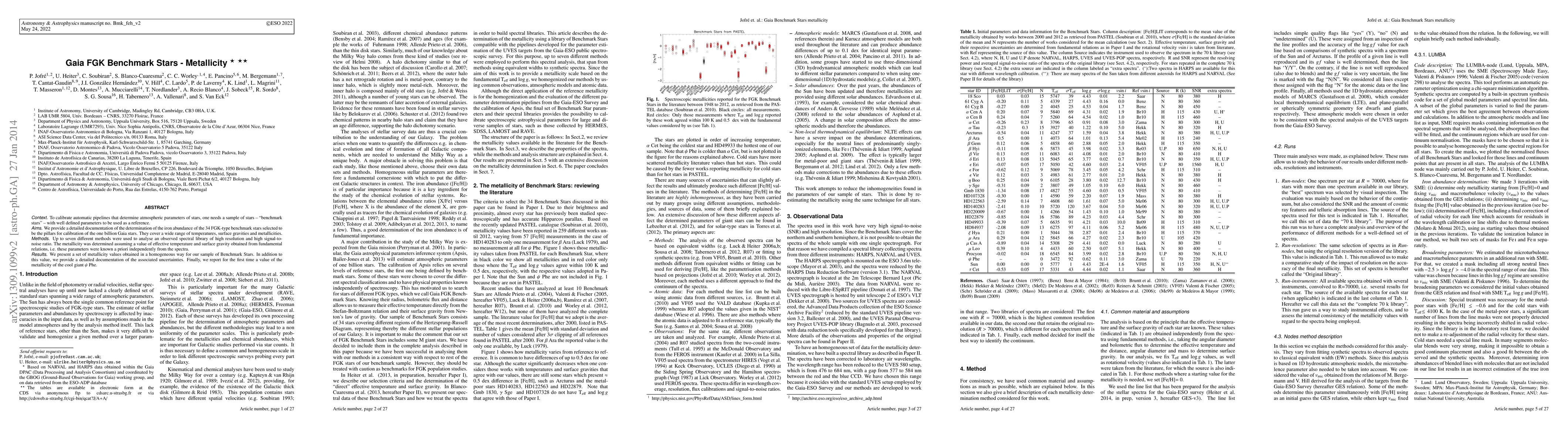 To calibrate automatic pipelines that determine atmospheric parameters of stars, one needs a sample of stars -- ``benchmark stars'' -- with well defined parameters to be used as a reference We provide a detailed documentation of the determination of the iron abundance of the 34 FGK-type benchmark stars selected to be the pillars for calibration of the one billion Gaia stars. They cover a wide range of temperatures, surface gravities and metallicities. Up to seven different methods were used to analyze an observed spectral library of high resolution and high signal-to-noise ratio. The metallicity was determined assuming a value of effective temperature and surface gravity obtained from fundamental relations, i.e. these parameters were known a priori independently from the spectra. We present a set of metallicity values obtained in a homogeneous way for our sample of Benchmark Stars. In addition to this value, we provide a detailed documentation of the associated uncertainties. Finally, we report for the first time a value of the metallicity of the cool giant psi Phe.