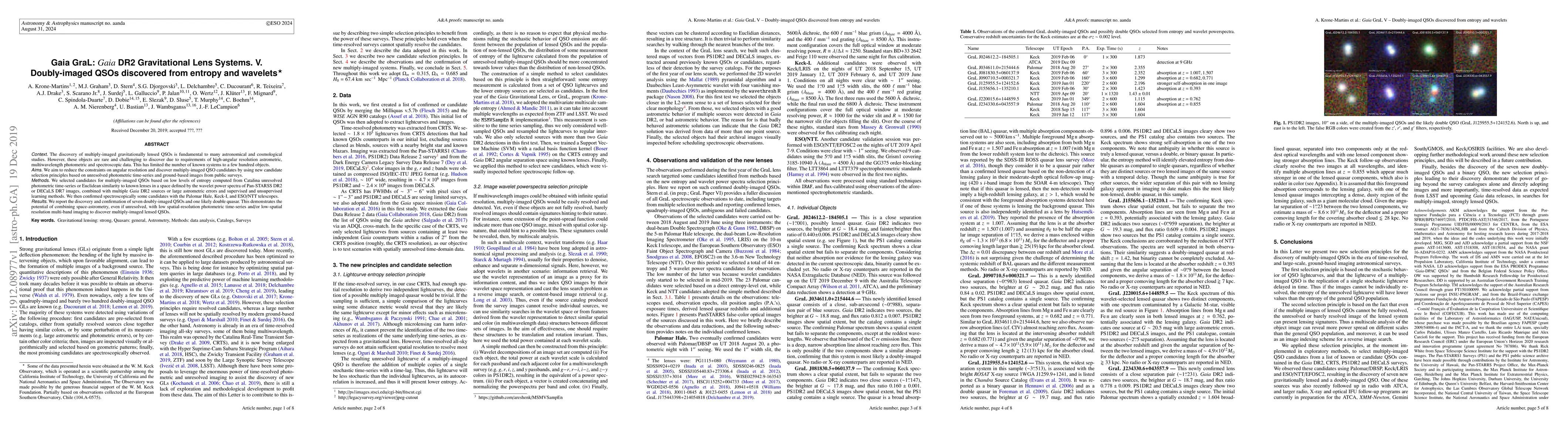 This paper reports the discovery of seven doubly-imaged QSOs and one likely double quasar using entropy and wavelet analysis of unresolved photometric time-series and low-resolution images. The method combines Gaia DR2 astrometry with supervised and unsupervised learning, demonstrating a new approach to identifying rare gravitationally lensed systems.