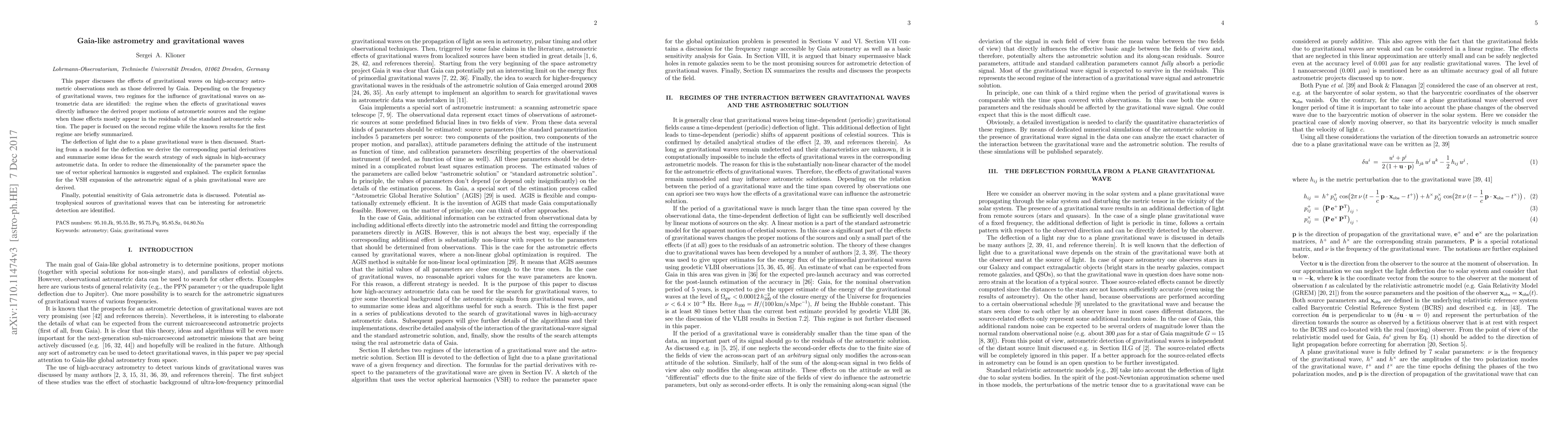 This paper explores gravitational waves' impact on high-precision astrometry, like Gaia's. It identifies two regimes of influence and focuses on how gravitational wave effects manifest in astrometric residuals. The study derives formulas for light deflection by gravitational waves using vector spherical harmonics, suggesting this method to manage parameter space dimensionality. It also discusses Gaia's potential to detect gravitational waves and identifies potential astrophysical sources.