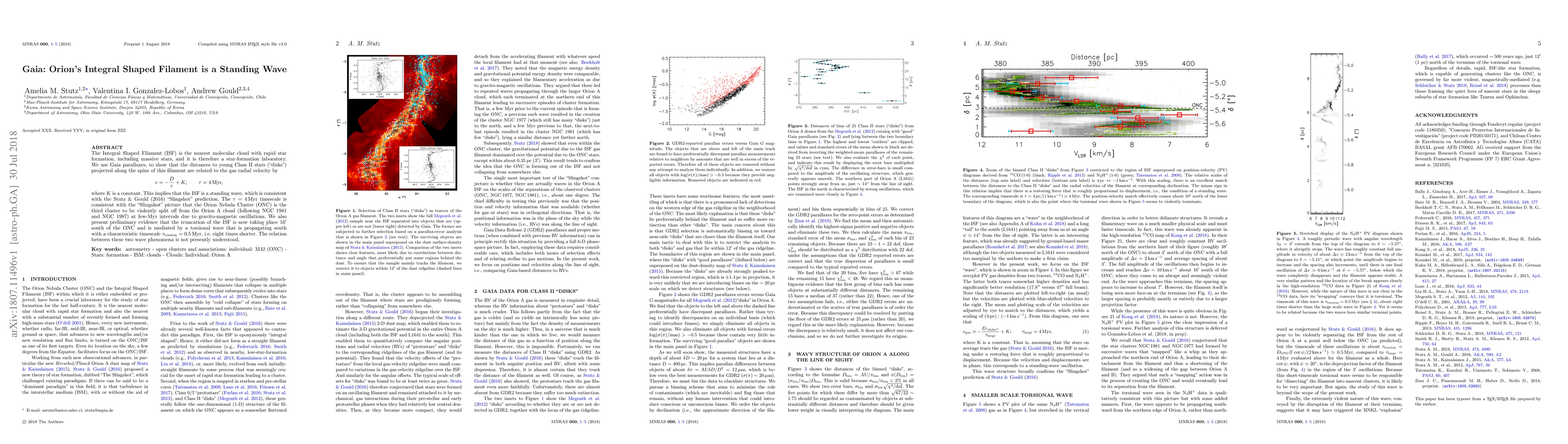 The Integral Shaped Filament (ISF) is the nearest molecular cloud with rapid star formation, including massive stars, and it is therefore a star-formation laboratory. We use Gaia parallaxes, to show that the distances to young Class II stars ('disks') projected along the spine of this filament are related to the gas radial velocity by $$ v = -{D\over\tau} + K;\qquad \tau = 4\,{\rm Myr}, $$ where $K$ is a constant. This implies that the ISF is a standing wave, which is consistent with the Stutz & Gould (2016) 'Slingshot' prediction. The $\tau=4\,{\rm Myr}$ timescale is consistent with the 'Slingshot' picture that the Orion Nebula Cluster (ONC) is the third cluster to be violently split off from the Orion A cloud (following NGC 1981 and NGC 1987) at few-Myr intervals due to gravito-magnetic oscillations. We also present preliminary evidence that the truncation of the ISF is now taking place $16^\prime$ south of the ONC and is mediated by a torsional wave that is propagating south with a characteristic timescale $\tau_{\rm torsion} = 0.5\,{\rm Myr}$, i.e. eight times shorter. The relation between these two wave phenomena is not presently understood.
