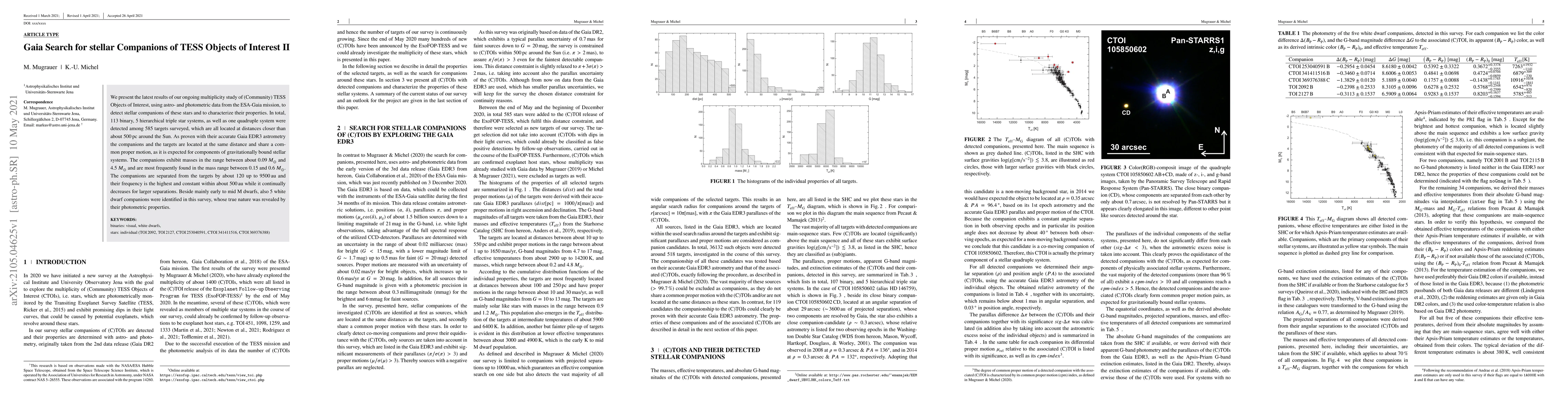 We present the latest results of our ongoing multiplicity study of (Community) TESS Objects of Interest, using astro- and photometric data from the ESA-Gaia mission, to detect stellar companions of these stars and to characterize their properties. In total, 113 binary, 5 hierarchical triple star systems, as well as one quadruple system were detected among 585 targets surveyed, which are all located at distances closer than about 500pc around the Sun. As proven with their accurate Gaia EDR3 astrometry the companions and the targets are located at the same distance and share a common proper motion, as it is expected for components of gravitationally bound stellar systems. The companions exhibit masses in the range between about 0.09$M_\odot$ and 4.5$M_\odot$ and are most frequently found in the mass range between 0.15 and 0.6$M_{\odot}$. The companions are separated from the targets by about 120 up to 9500au and their frequency is the highest and constant within about 500au while it continually decreases for larger separations. Beside mainly early to mid M dwarfs, also 5 white dwarf companions were identified in this survey, whose true nature was revealed by their photometric properties.