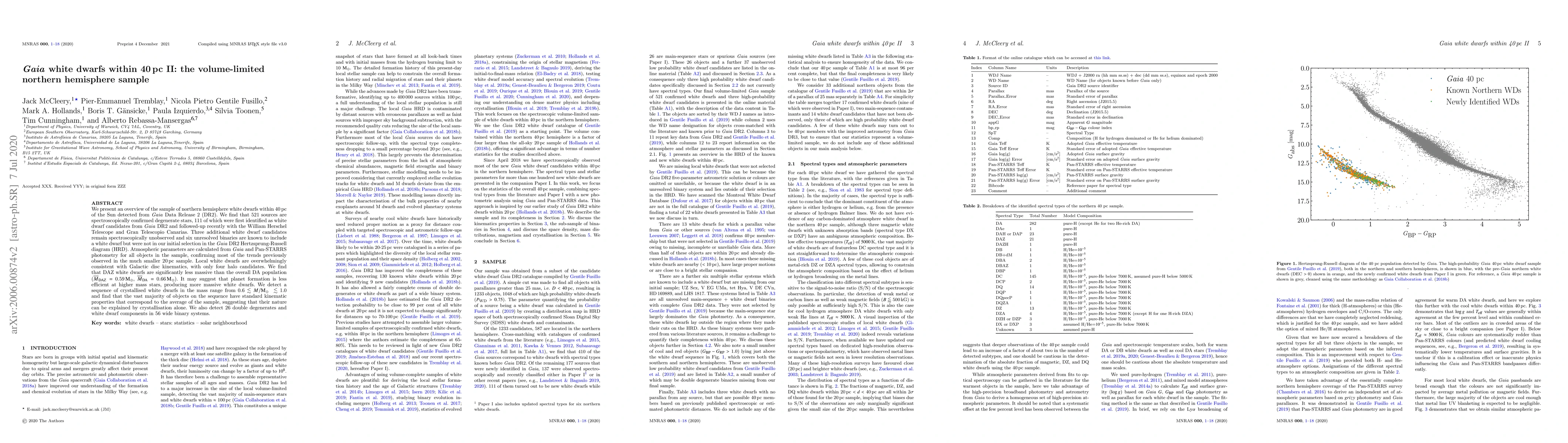 We present an overview of the sample of northern hemisphere white dwarfs within 40 pc of the Sun detected from $Gaia$ Data Release 2 (DR2). We find that 521 sources are spectroscopically confirmed degenerate stars, 111 of which were first identified as white dwarf candidates from $Gaia$ DR2 and followed-up recently with the William Herschel Telescope and Gran Telescopio Canarias. Three additional white dwarf candidates remain spectroscopically unobserved and six unresolved binaries are known to include a white dwarf but were not in our initial selection of white dwarfs in the $Gaia$ DR2 Hertzsprung-Russell diagram (HRD). Atmospheric parameters are calculated from $Gaia$ and Pan-STARRS photometry for all objects in the sample, confirming most of the trends previously observed in the much smaller 20 pc sample. Local white dwarfs are overwhelmingly consistent with Galactic disc kinematics, with only four halo candidates. We find that DAZ white dwarfs are significantly less massive than the overall DA population ($\overline{M}_\mathrm{DAZ} = 0.59\,\mathrm{M}_\odot$, $\overline{M}_\mathrm{DA} = 0.66\,\mathrm{M}_\odot$). It may suggest that planet formation is less efficient at higher mass stars, producing more massive white dwarfs. We detect a sequence of crystallised white dwarfs in the mass range from $0.6\ \lesssim M/\mathrm{M}_\odot \lesssim\ 1.0\,$ and find that the vast majority of objects on the sequence have standard kinematic properties that correspond to the average of the sample, suggesting that their nature can be explained by crystallisation alone. We also detect 56 wide binaries including a white dwarf and 26 double degenerates.