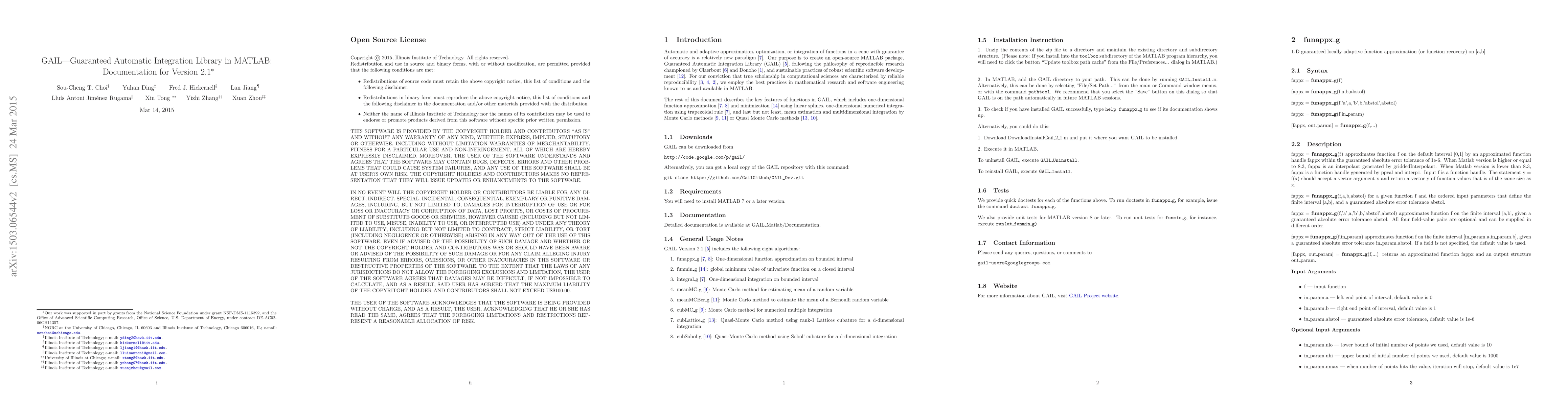 Automatic and adaptive approximation, optimization, or integration of functions in a cone with guarantee of accuracy is a relatively new paradigm. Our purpose is to create an open-source MATLAB package, Guaranteed Automatic Integration Library (GAIL), following the philosophy of reproducible research and sustainable practices of robust scientific software development. For our conviction that true scholarship in computational sciences are characterized by reliable reproducibility, we employ the best practices in mathematical research and software engineering known to us and available in MATLAB. This document describes the key features of functions in GAIL, which includes one-dimensional function approximation and minimization using linear splines, one-dimensional numerical integration using trapezoidal rule, and last but not least, mean estimation and multidimensional integration by Monte Carlo methods or Quasi Monte Carlo methods.