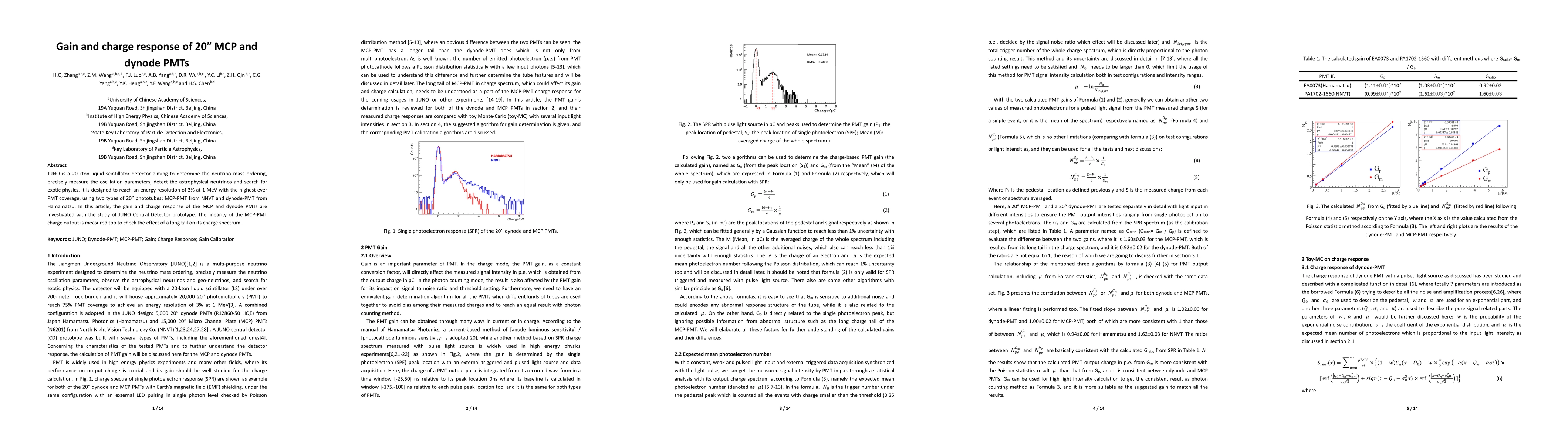 This paper investigates the gain and charge response of 20 inch MCP-PMTs from NNVT and dynode-PMTs from Hamamatsu for the JUNO detector, aiming to achieve high energy resolution and coverage. It also examines the linearity of MCP-PMT charge output to assess the impact of long tail effects on its charge spectrum.