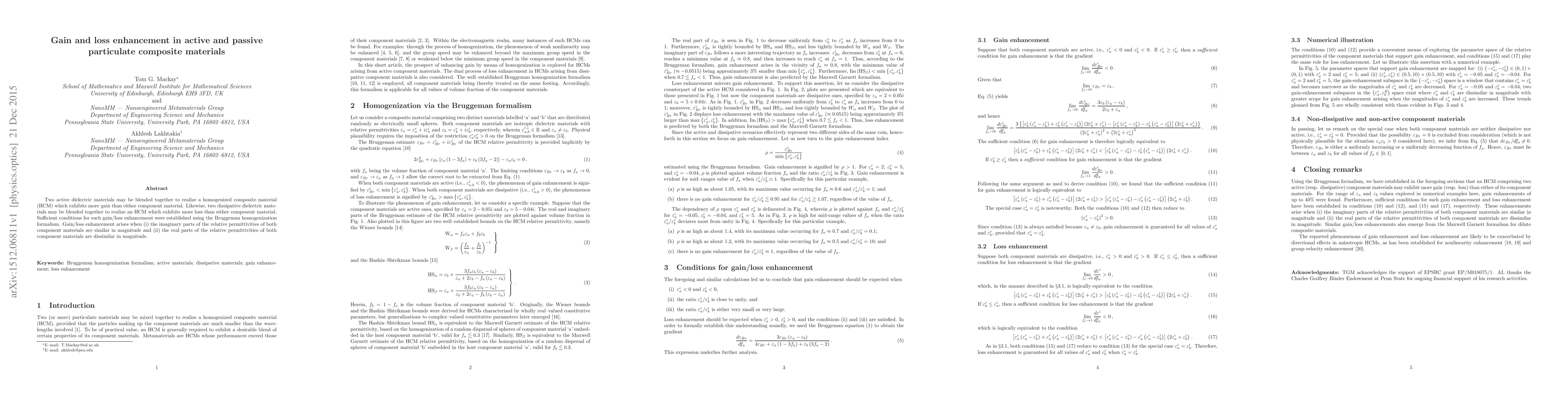 Two active dielectric materials may be blended together to realize a homogenized composite material (HCM) which exhibits more gain than either component material. Likewise, two dissipative dielectric materials may be blended together to realize an HCM which exhibits more loss than either component material. Sufficient conditions for such gain/loss enhancement were established using the Bruggeman homogenization formalism. Gain/loss enhancement arises when (i) the imaginary parts of the relative permittivities of both component materials are similar in magnitude and (ii) the real parts of the relative permittivities of both component materials are dissimilar in magnitude.
