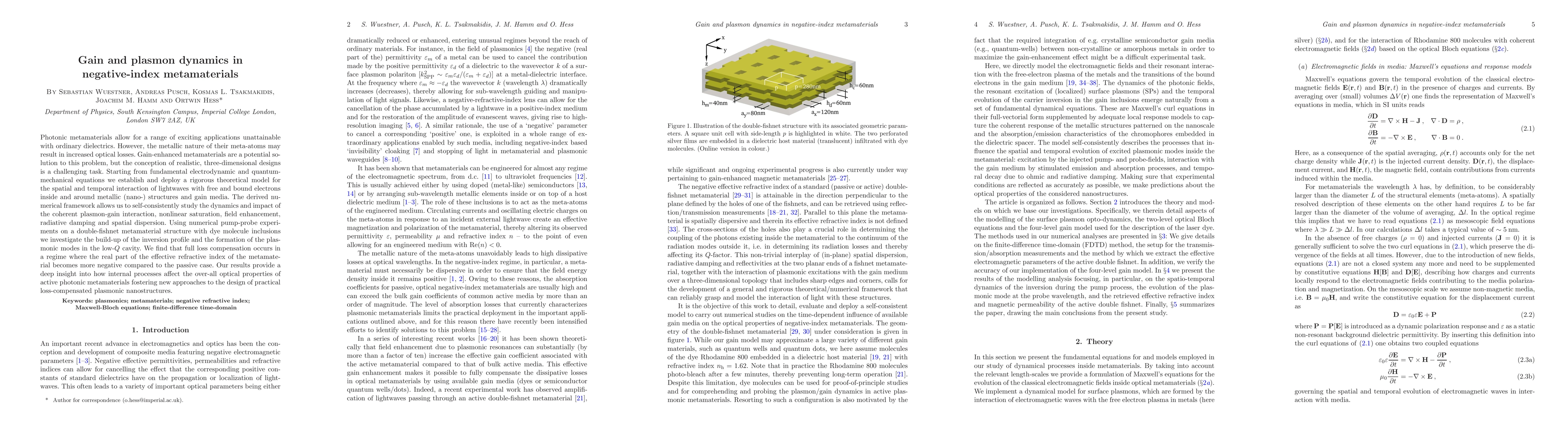 Photonic metamaterials allow for a range of exciting applications unattainable with ordinary dielectrics. However, the metallic nature of their meta-atoms may result in increased optical losses. Gain-enhanced metamaterials are a potential solution to this problem, but the conception of realistic, three-dimensional designs is a challenging task. Starting from fundamental electrodynamic and quantum-mechanical equations we establish and deploy a rigorous theoretical model for the spatial and temporal interaction of lightwaves with free and bound electrons inside and around metallic (nano-) structures and gain media. The derived numerical framework allows us to self-consistently study the dynamics and impact of the coherent plasmon-gain interaction, nonlinear saturation, field enhancement, radiative damping and spatial dispersion. Using numerical pump-probe experiments on a double-fishnet metamaterial structure with dye molecule inclusions we investigate the build-up of the inversion profile and the formation of the plasmonic modes in the low-Q cavity. We find that full loss compensation occurs in a regime where the real part of the effective refractive index of the metamaterial becomes more negative compared to the passive case. Our results provide a deep insight into how internal processes affect the over-all optical properties of active photonic metamaterials fostering new approaches to the design of practical loss-compensated plasmonic nanostructures.