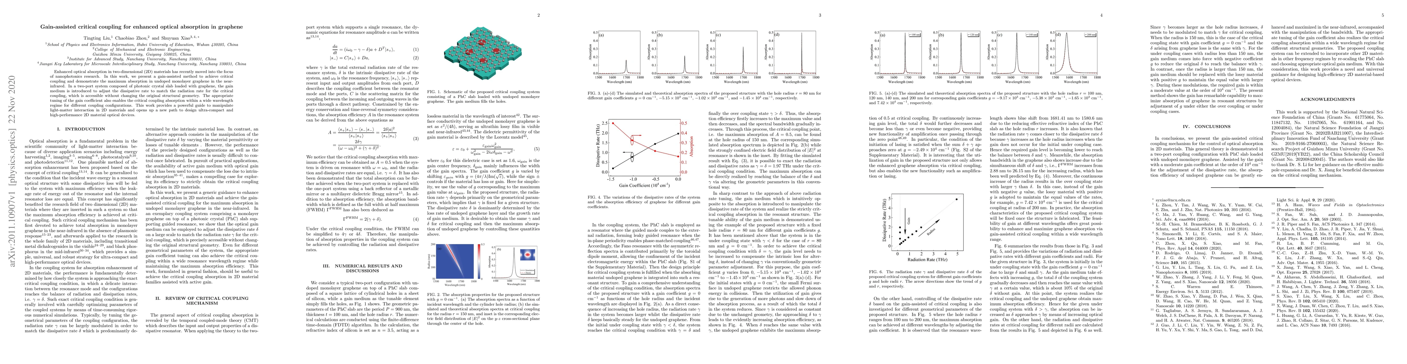 This paper proposes a gain-assisted method to achieve critical coupling for maximum optical absorption in undoped monolayer graphene in the near-infrared. By introducing a gain medium in a photonic crystal slab system, the method adjusts the dissipative rate to match the radiation rate, enabling critical coupling without altering the structural geometry.