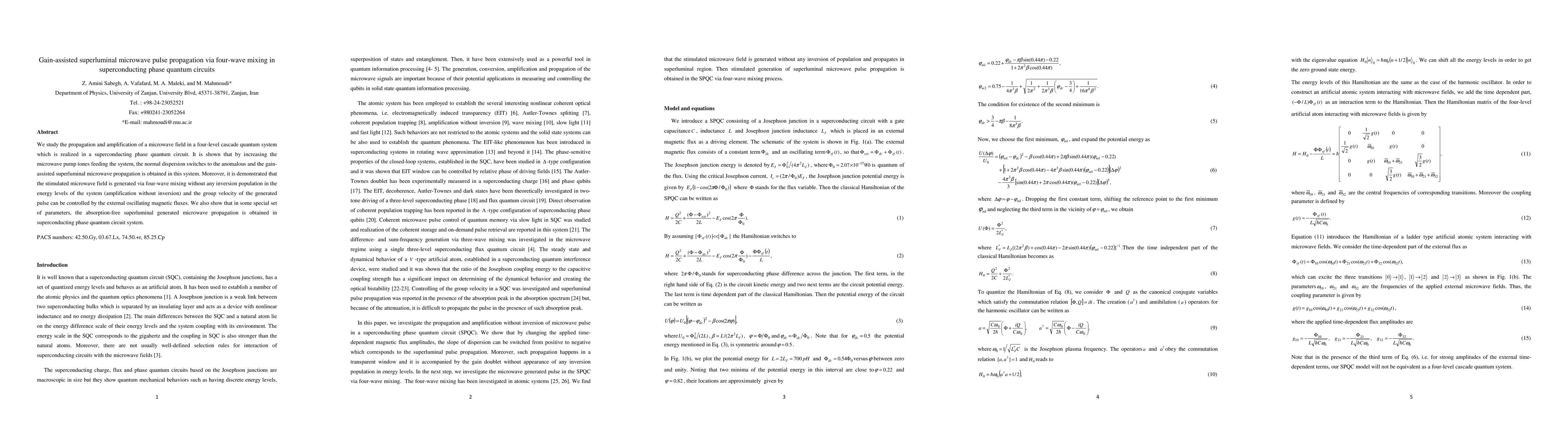 This paper investigates microwave propagation in a superconducting phase quantum circuit, demonstrating gain-assisted superluminal propagation via four-wave mixing. The study reveals that increasing microwave pump tones can switch dispersion to anomalous, enabling amplification without inversion and control over the group velocity via external magnetic fluxes.