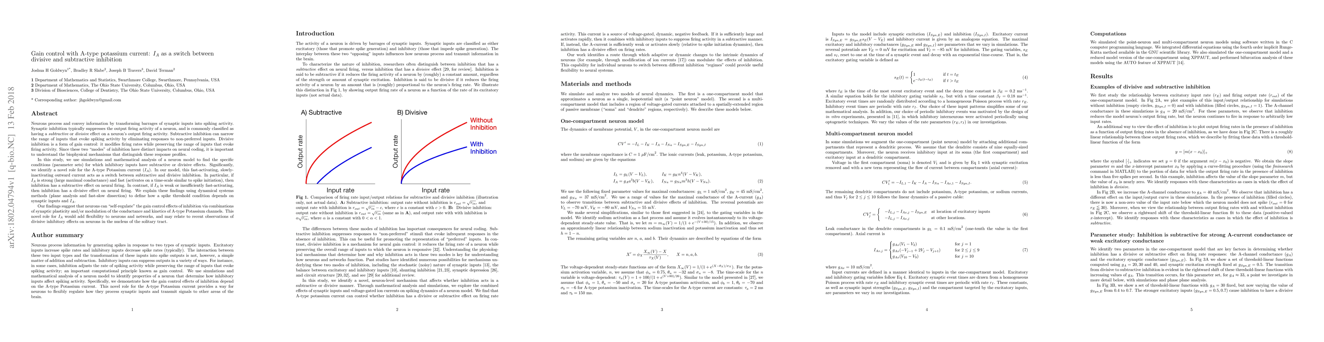 This paper investigates how A-type potassium current (IA) acts as a switch between subtractive and divisive inhibition in neurons, demonstrating that strong IA promotes subtractive inhibition while weak or slow IA induces divisive inhibition. The findings suggest that neurons can regulate inhibition's gain control effects through modulation of IA, adding flexibility to neural coding.