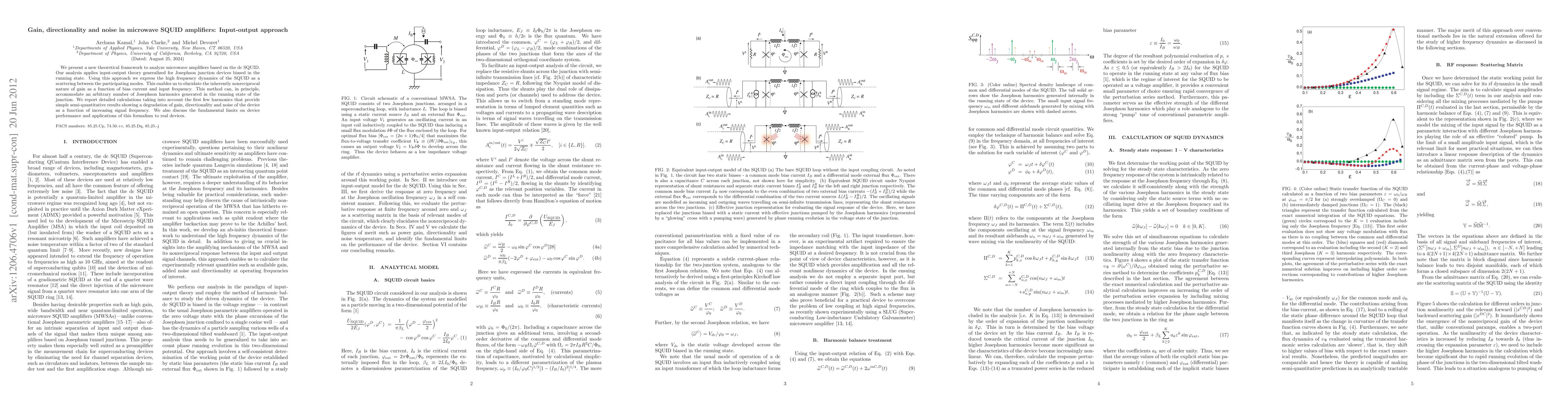 This paper introduces a theoretical framework for analyzing microwave amplifiers based on dc SQUIDs using input-output theory, revealing the nonreciprocal nature of gain influenced by bias current and frequency. The study shows that gain, directionality, and noise degrade with increasing signal frequency, and discusses fundamental performance limits and applications.