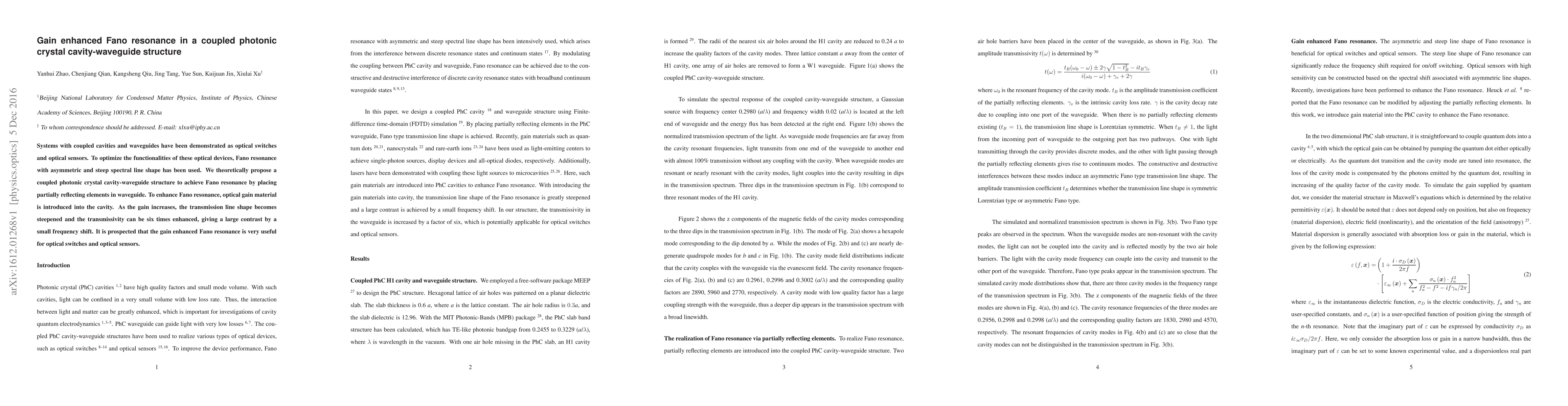 This paper proposes a photonic crystal cavity-waveguide structure with partially reflecting elements to achieve enhanced Fano resonance. By introducing optical gain material into the cavity, the transmission line shape becomes steeper, and the transmissivity is significantly enhanced, making it highly effective for optical switches and sensors.