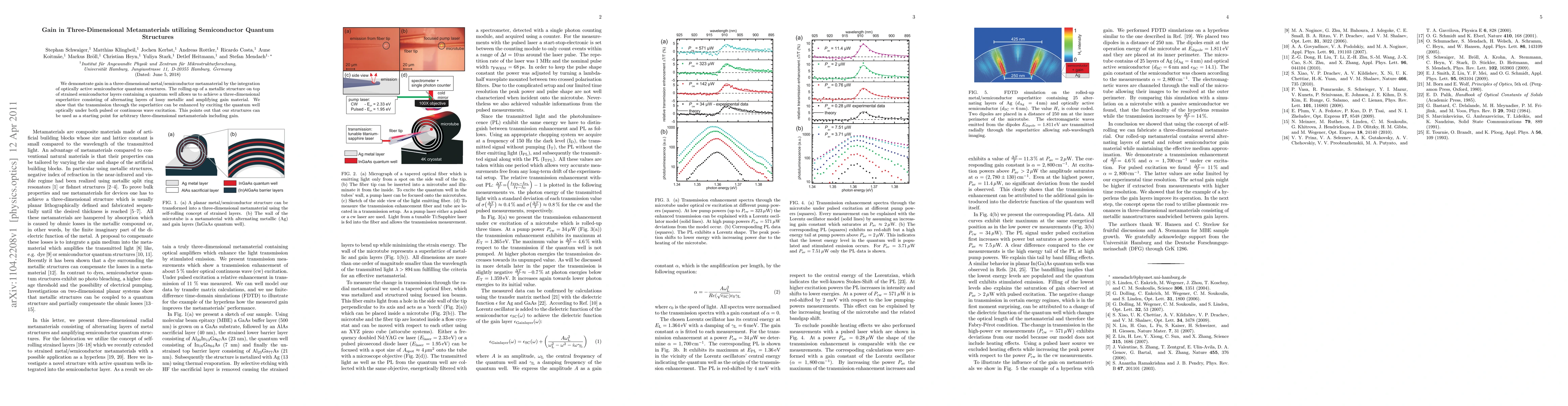 This paper demonstrates gain in a three-dimensional metal/semiconductor metamaterial by integrating optically active semiconductor quantum structures, achieving enhanced transmission via quantum well excitation. The proposed superlattice structure suggests potential for developing advanced three-dimensional metamaterials with gain capabilities.