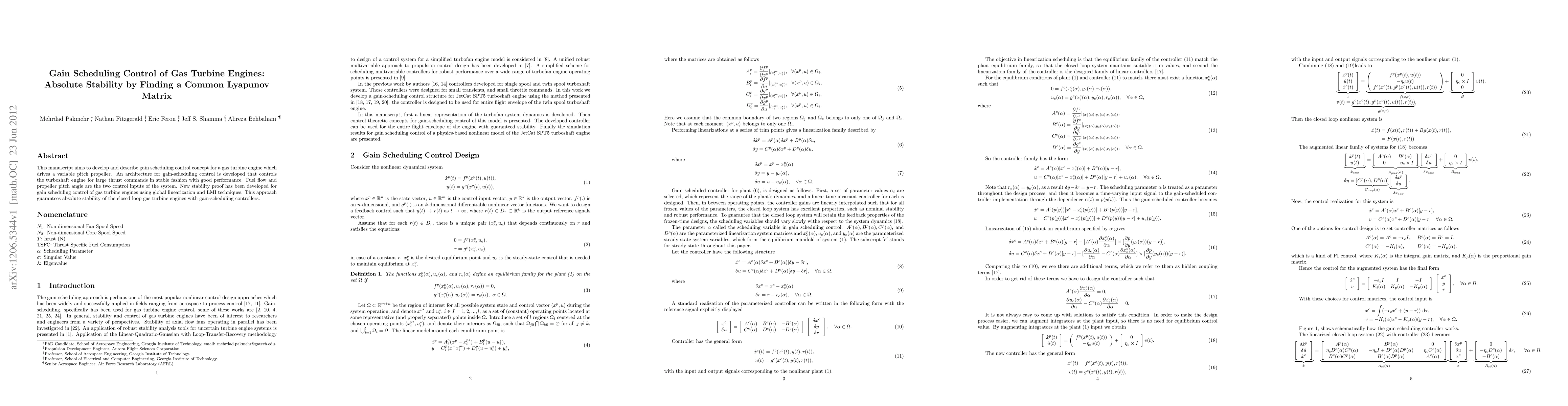 This manuscript aims to develop and describe gain scheduling control concept for a gas turbine engine which drives a variable pitch propeller. An architecture for gain-scheduling control is developed that controls the turboshaft engine for large thrust commands in stable fashion with good performance. Fuel ow and propeller pitch angle are the two control inputs of the system. New stability proof has been developed for gain scheduling control of gas turbine engines using global linearization and LMI techniques. This approach guarantees absolute stability of the closed loop gas turbine engine systems with gain-scheduling controllers.