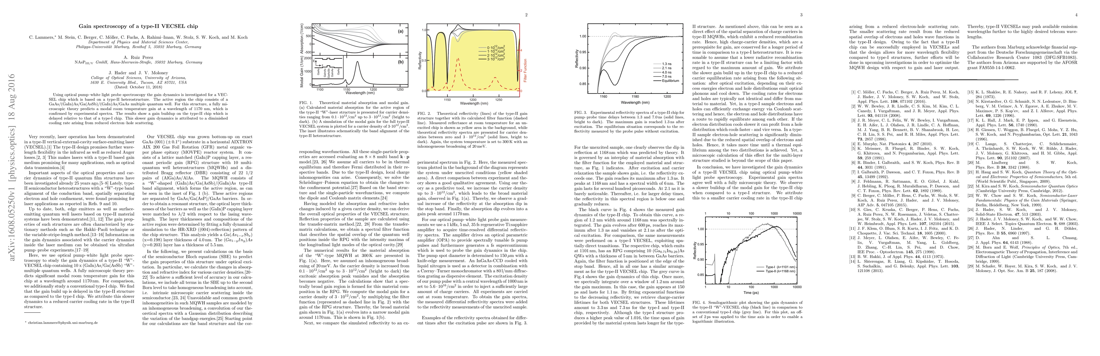 This paper investigates the gain dynamics of a type-II VECSEL chip using optical spectroscopy, confirming a predicted room temperature gain at 1170 nm. The study finds a delayed gain buildup in the type-II chip compared to type-I, attributed to reduced electron-hole scattering and a slower cooling rate.