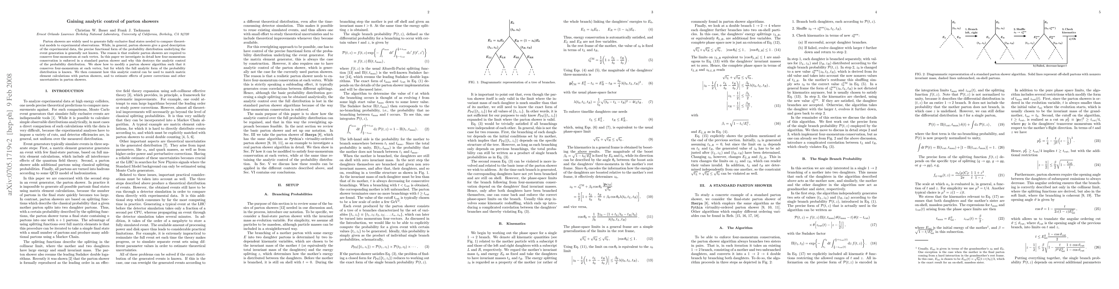 Parton showers are widely used to generate fully exclusive final states needed to compare theoretical models to experimental observations. While, in general, parton showers give a good description of the experimental data, the precise functional form of the probability distribution underlying the event generation is generally not known. The reason is that realistic parton showers are required to conserve four-momentum at each vertex. In this paper we investigate in detail how four-momentum conservation is enforced in a standard parton shower and why this destroys the analytic control of the probability distribution. We show how to modify a parton shower algorithm such that it conserves four-momentum at each vertex, but for which the full analytic form of the probability distribution is known. We then comment how this analytic control can be used to match matrix element calculations with parton showers, and to estimate effects of power corrections and other uncertainties in parton showers.