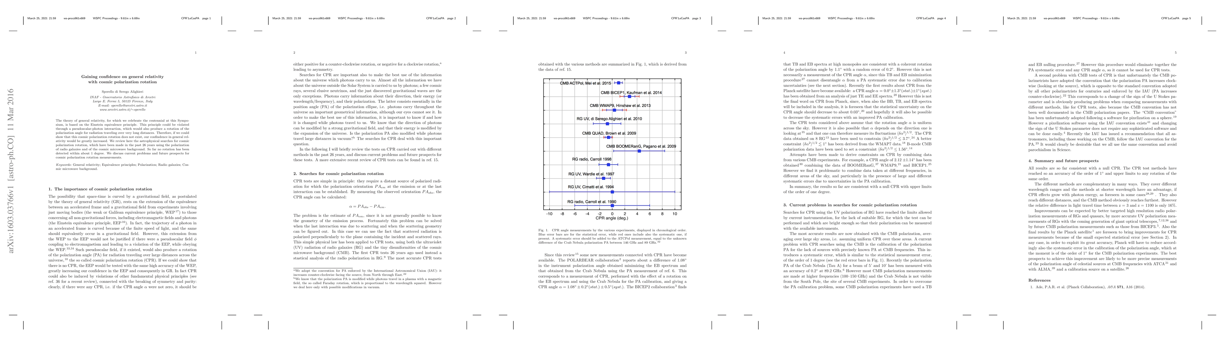 The theory of general relativity, for which we celebrate the centennial at this Symposium, is based on the Einstein equivalence principle. This principle could be violated through a pseudoscalar-photon interaction, which would also produce a rotation of the polarization angle for radiation traveling over very long distances. Therefore, if we could show that this cosmic polarization rotation does not exist, our confindence in general relativity would be greatly increased. We review here the astrophysical searches for cosmic polarization rotation, which have been made in the past 26 years using the polarization of radio galaxies and of the cosmic microwave background. So far no rotation has been detected within about 1 degree. We discuss current problems and future prospects for cosmic polarization rotation measurements.