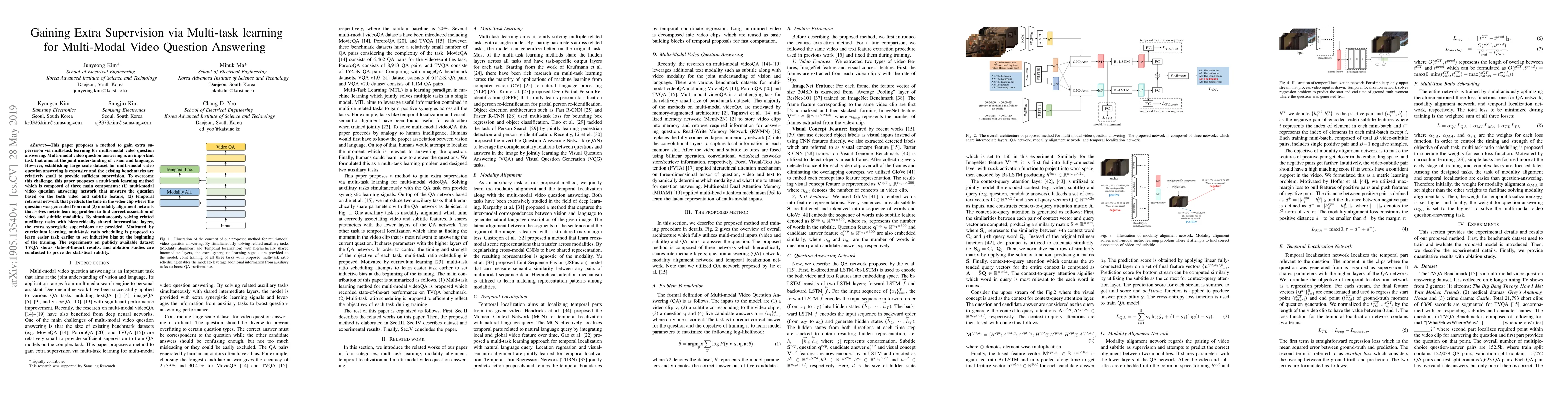 This paper introduces a multi-task learning approach for multi-modal video question answering, utilizing a network that combines video and subtitle features, a temporal retrieval network, and a modality alignment network to provide extra supervision. The proposed curriculum learning method achieves state-of-the-art results on the TVQA dataset, demonstrating the effectiveness of the approach.