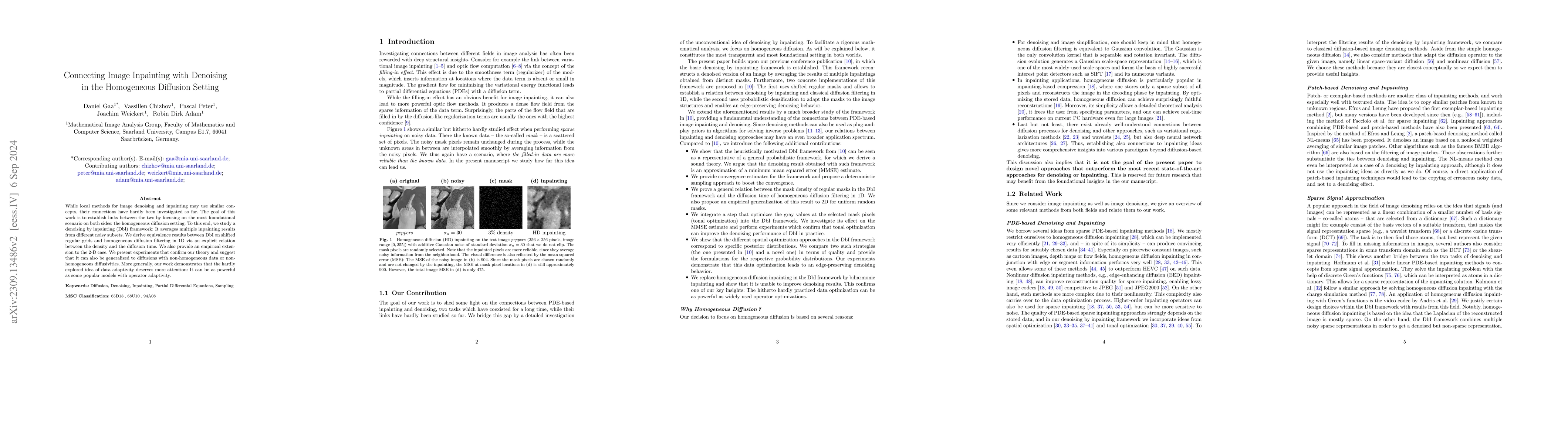This paper explores a denoising by inpainting (DbI) framework that leverages the filling-in effect of diffusion processes to interpolate and average noisy data, achieving higher confidence in interpolated results. The authors propose strategies to select pixel locations and adapt pixel values, emphasizing data adaptivity over operator adaptivity, and establish theoretical foundations for the method.
